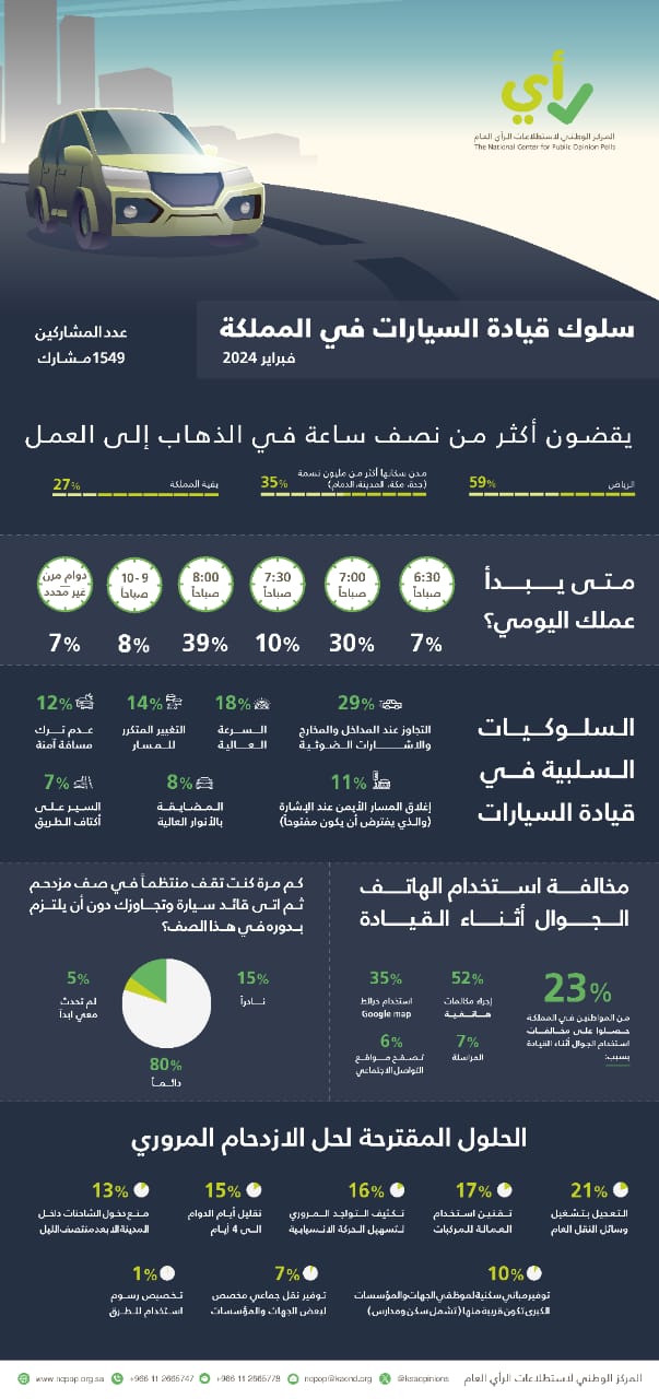 صراحة – الرياض :اجرى المركز الوطني لاستطلاعات الرأي العام “رأي” التابع لمركز الملك عبدالعزيز للتواصل الحضاري استطلاعاً عاما عن سلوك قيادة السيارات في المملكة. تكونت عينة الاستطلاع من 1549 مواطناً ومواطنة. واجري الاستطلاع في مطلع شهر فبراير الحالي. واتضح من النتائج الاختلاف في زمن الرحلة من المنزل إلى العمل بحسب الكثافة السكانية للمدن والمحافظات. إذ أفاد 59% من سكان مدينة الرياض أن الرحلة اليومية إلى مقر العمل تأخذ منهم أكثر من نصف ساعة، مقابل 35% لسكان المدن المليونية (مدن تعداد سكانها أكثر من مليون نسمة، باستثناء مدينة الرياض ذات السبعة ملايين نسمة، وهي مدن جدة ومكة المكرمة والدمام والمدينة المنورة). و27% لسكان بقية مدن ومحافظات وقرى المملكة. وأفاد 79% من العينة أن عملهم اليومي يبدأ بين 7 و8 صباحاً.