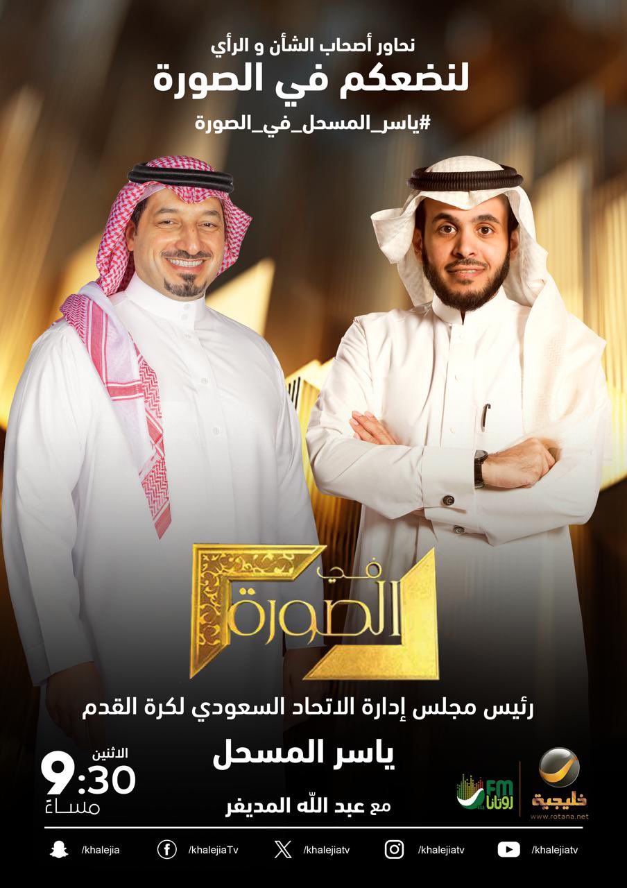 يستضيف الإعلامي عبد الله المديفر في الحلقة القادمة من برنامجه الأسبوعي “في الصورة”، رئيس مجلس إدارة الاتحاد السعودي لكرة القدم ياسر المسحل، في حوار خاص يُعرض مساء الاثنين عند الساعة 9:30 عبر قناة خليجية وإذاعة روتانا FM.