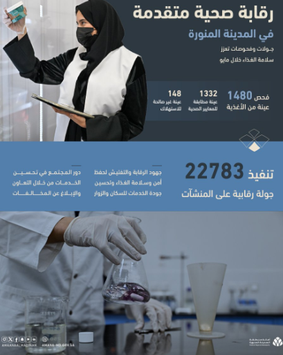 كما أجرت أمانة المدينة المنورة 1480 تحليلاً مخبرياً على أنواع من الأغذية خلال الشهر الماضي، للتأكد من مطابقتها للمعايير اللازمة، ومدى صلاحيتها للاستهلاك، مبينة أن نتائج التحاليل الكيميائية أظهرت مطابقة 1332 عينة، إلى جانب 148 عينة غير صالحة للاستهلاك، مؤكدة استمرار تنفيذ الجولات الرقابية، وإجراء عمليات الفحص، لتعزز الدور الرقابي على الغذاء، والحدّ من التلوث البيئي في المنشآت.