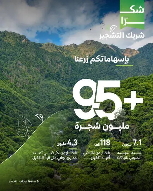 زراعة أكثر من 95 مليون شجرة في أنحاء #المملكة منذ إطلاق #مبادرة_السعودية_الخضراء