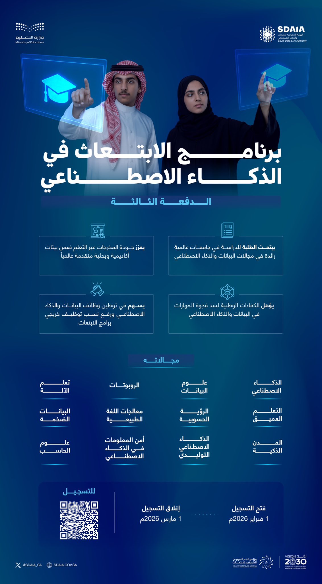 أعلنت الهيئة السعودية للبيانات والذكاء الاصطناعي (سدايا)، بالتعاون مع وزارة التعليم، عن فتح باب التسجيل في الدفعة الثالثة من برنامج الابتعاث في مجالات الذكاء الاصطناعي. تهدف هذه المبادرة إلى بناء قدرات وطنية مؤهلة تأهيلاً عالياً في أرقى الجامعات العالمية، مما يساهم في سد فجوة المهارات الرقمية وتوطين وظائف البيانات والذكاء الاصطناعي لرفع نسب توظيف الخريجين في بيئات أكاديمية وبحثية متقدمة.