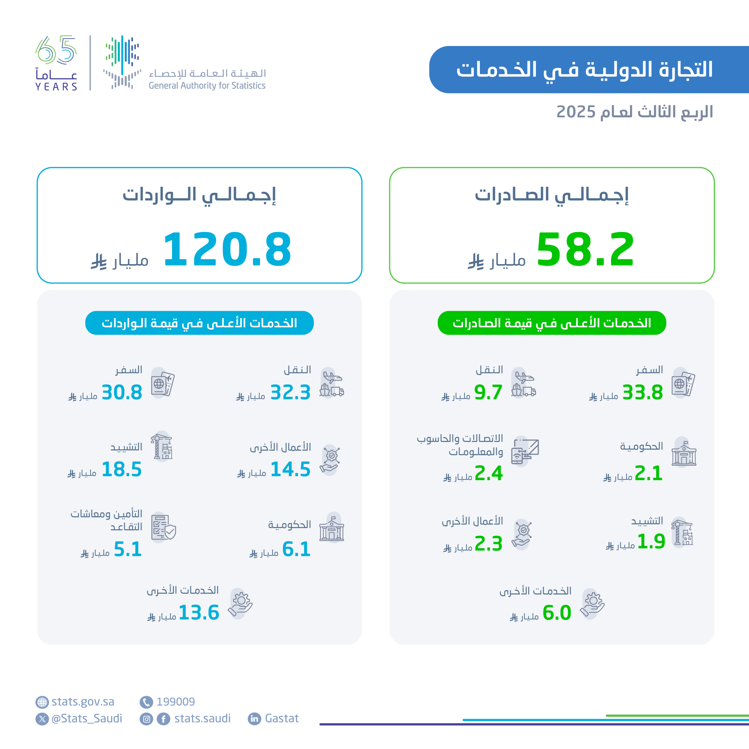 أوضحت الهيئة العامة للإحصاء أن قيمة صادرات الخدمات من المملكة العربية السعودية للربع الثالث من عام 2025م بلغت (58.2) مليار ريال سعودي، وبلغت قيمة واردات الخدمات إلى المملكة العربية السعودية للربع الثالث من عام 2025م (120.8) مليار ريال سعودي.