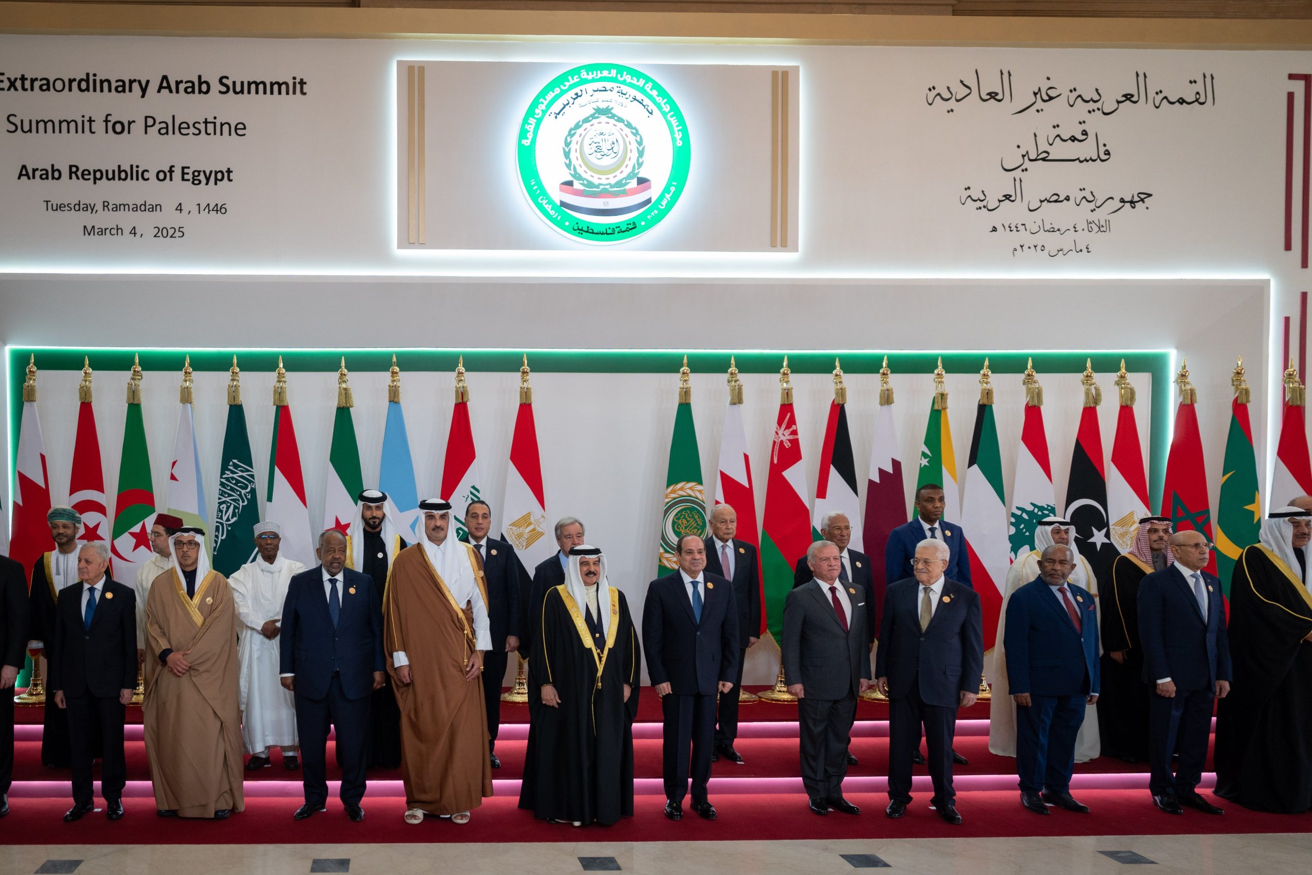 وإذ اجتمعنا في القاهرة اليوم الثلاثاء 4 مارس 2025 الموافق 4 رمضان 1446، استجابة لدعوة من فخامة الرئيس عبدالفتاح السيسي رئيس جمهورية مصر العربية، وبالتنسيق مع صاحب الجلالة الملك حمد بن عيسى آل خليفة ملك مملكة البحرين رئيس الدورة العادية الثالثة والثلاثين على مستوى القمة، وبناءً على طلب دولة فلسطين بعقد قمة غير عادية؛ لبحث التطورات الخطيرة التي شهدتها القضية الفلسطينية خلال المرحلة الأخيرة.