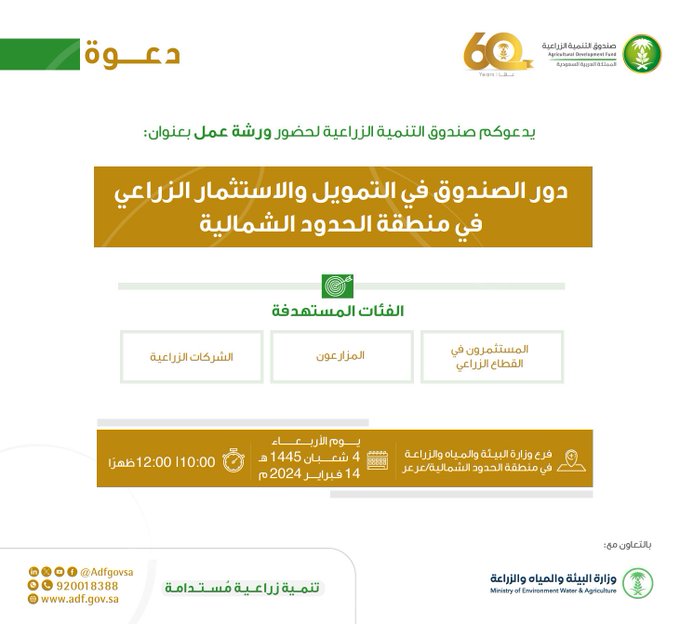 الدعوة عامة للمزارعين والمستثمرين والجمعيات التعاونية. سيتم خلال الورشة استعراض دور الصندوق في دعم التمويل والاستثمار في قطاع الزراعة وفرص الاستثمار المتاحة في منطقة الحدود الشمالية.