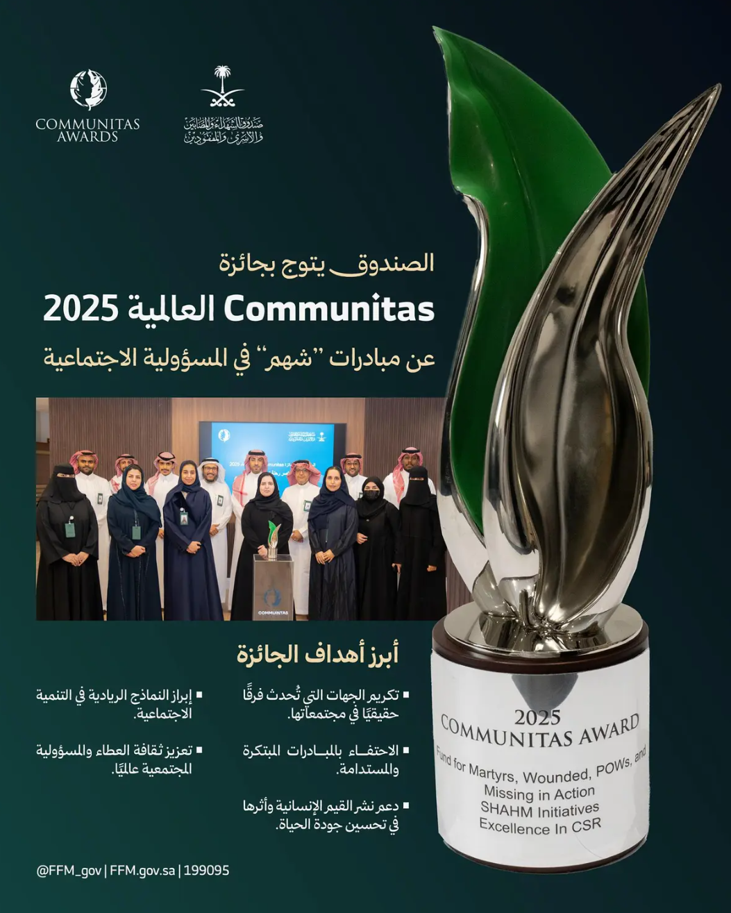 “صندوق الشهداء” يحقق جائزة Communitas العالمية عن مبادرات “شهم” في المسؤولية الاجتماعية