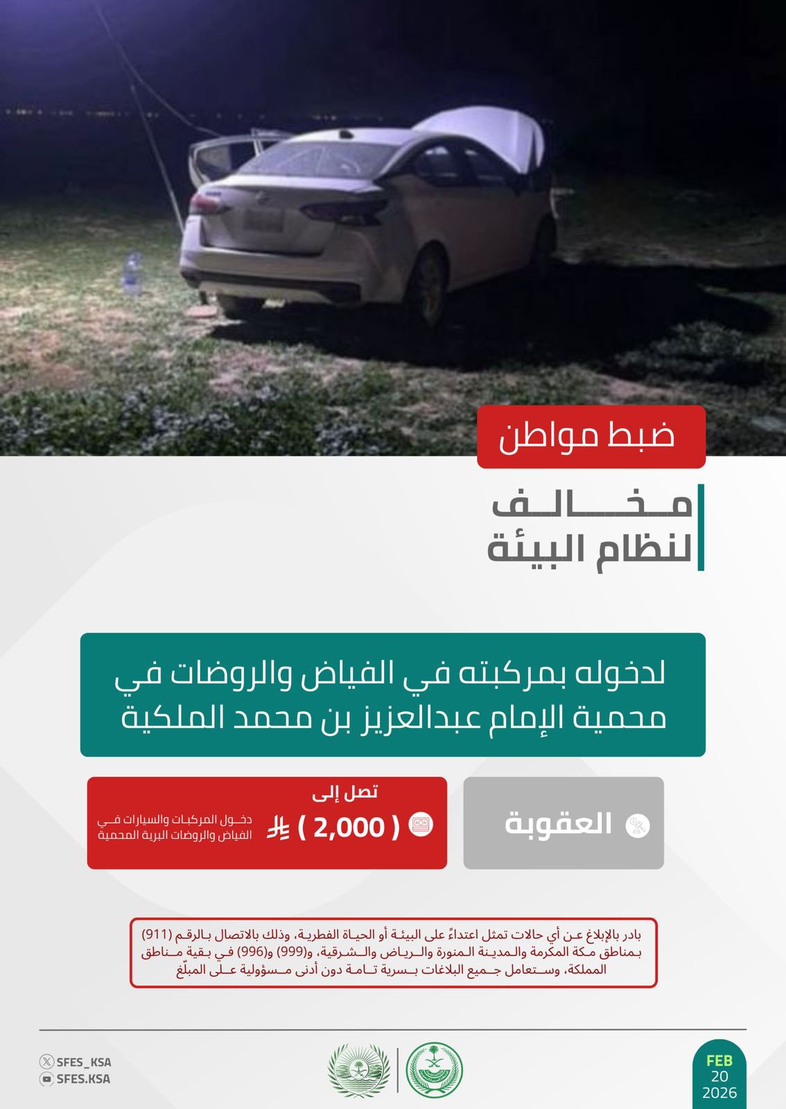 وأوضحت القوات أن عقوبة دخول المركبات والسيارات في الفياض والروضات البرية المحمية تصل إلى (2,000) ريال، حاثةً على الإبلاغ عن أي حالات تمثل اعتداءً على البيئة أو الحياة الفطرية على الرقم (911) بمناطق مكة المكرمة والمدينة المنورة والرياض والشرقية، و(999) و(996) في بقية مناطق المملكة، وستعامل جميع البلاغات بسرية تامة دون أدنى مسؤولية على المبلّغ.