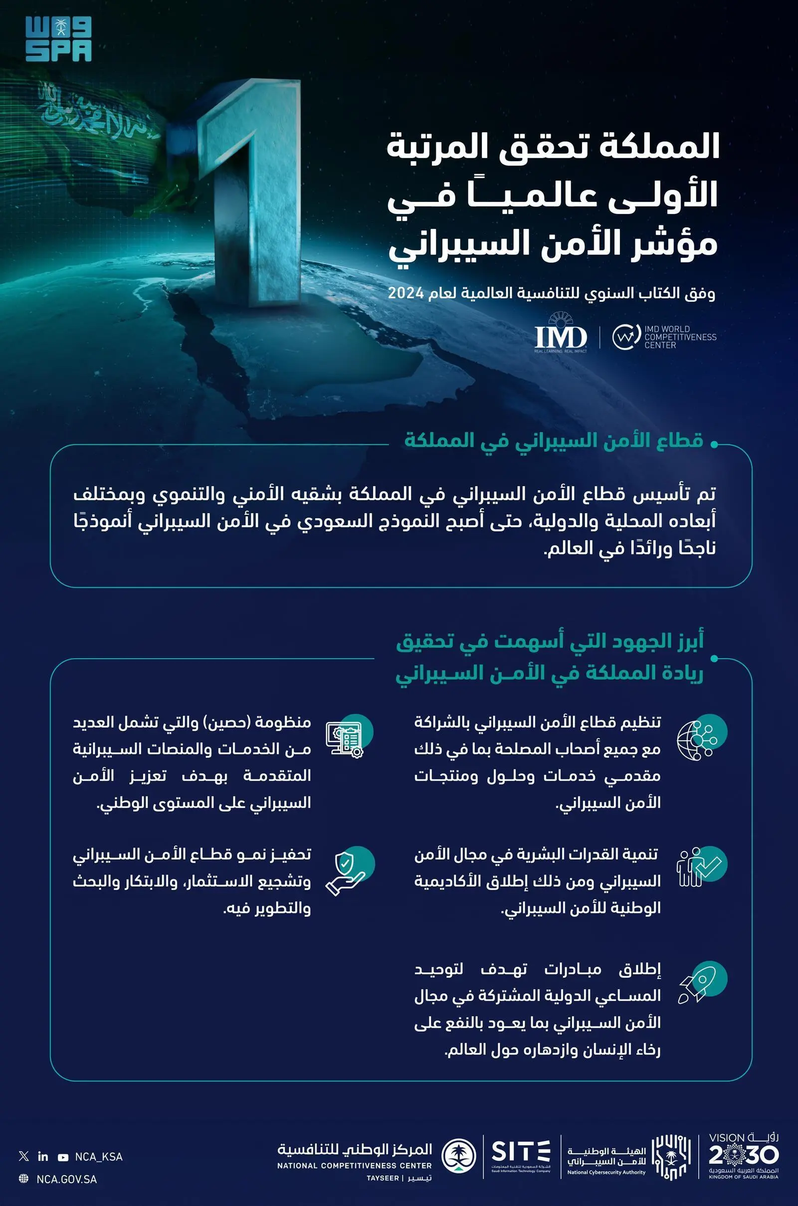 حققت المملكة العربية السعودية المرتبة الأولى عالمياً في مؤشر الأمن السيبراني وذلك ضمن تقرير الكتاب السنوي للتنافسية العالمية لعام 2024 الصادر عن مركز التنافسية العالمي التابع للمعهد الدولي للتنمية الإدارية (IMD) بسويسرا.