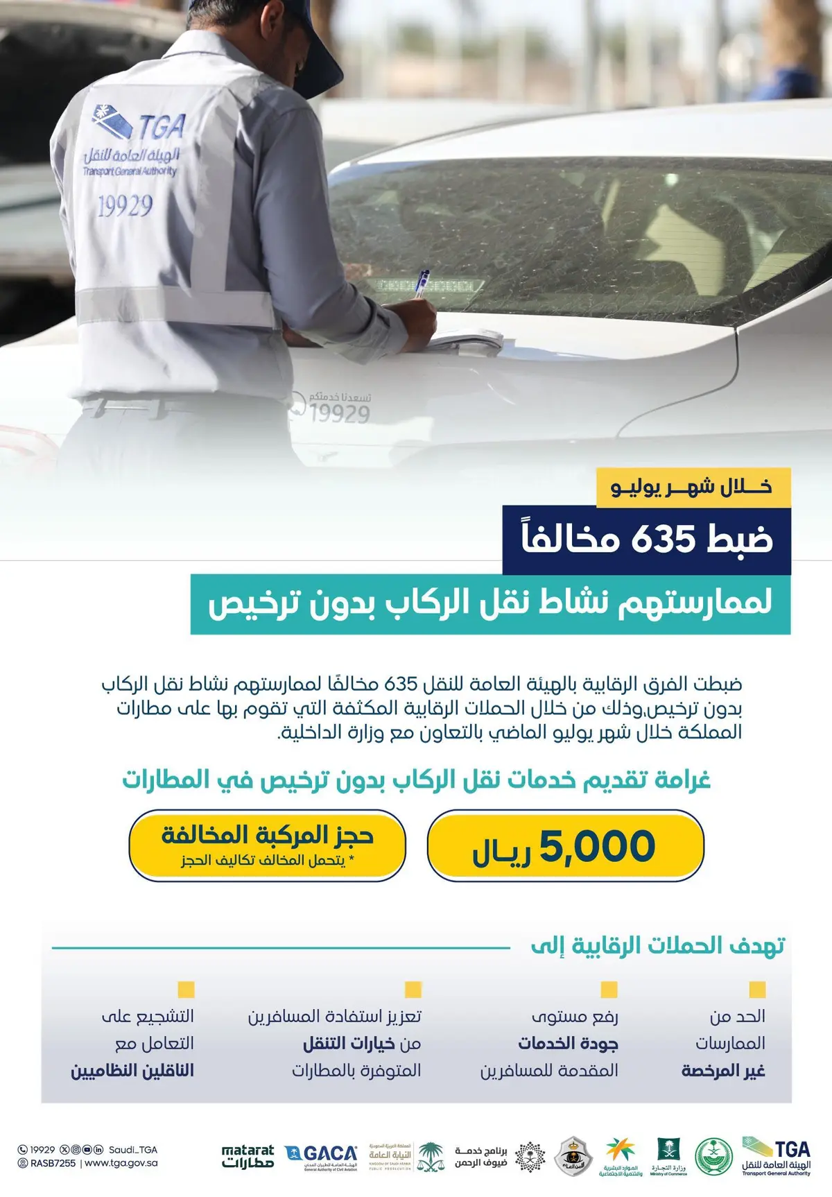صراحة – الرياض: ضبطت الهيئة العامة للنقل (635) مخالفًا لأنظمة الهيئة في عددٍ من مطارات المملكة خلال شهر يوليو الماضي، لممارستهم نشاط نقل الركاب دون ترخيص؛ وذلك نتيجة للحملات الرقابية المكثفة التي تنفذها الهيئة بالتعاون مع وزارة الداخلية والجهات المعنية.