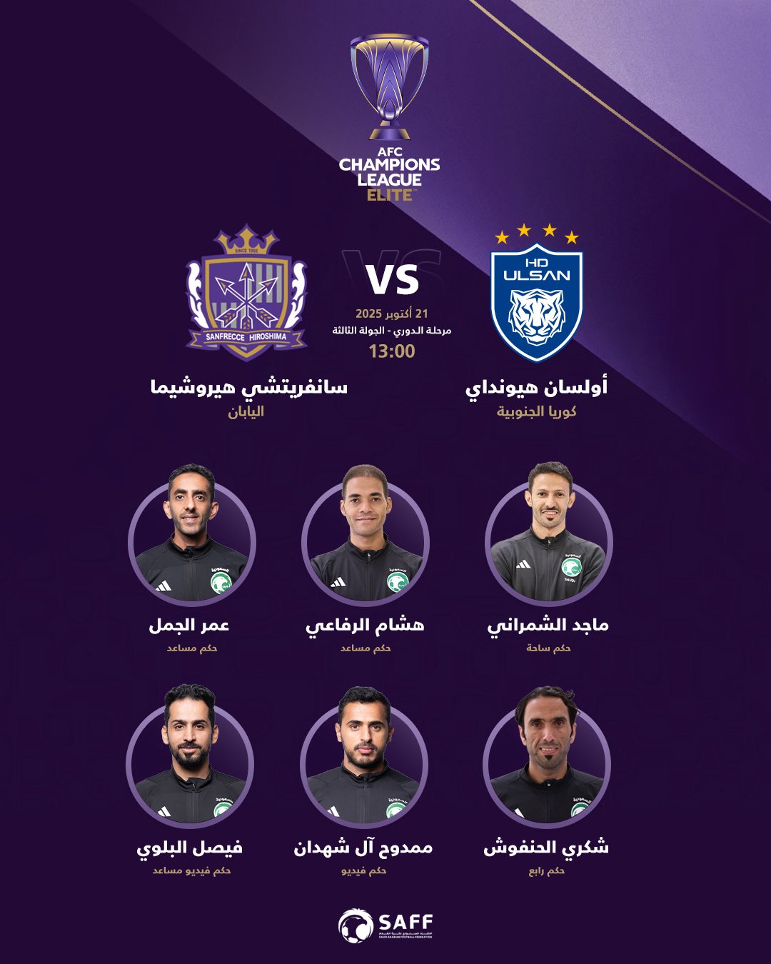 الحكم السعودي “ماجد الشمراني” يدير مباراة “أولسان هيونداي” و”سانفريتشي هيروشيما” في دوري أبطال آسيا للنخبة
