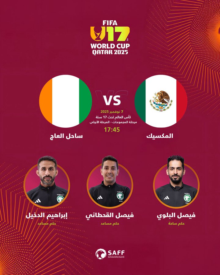 أعلن الاتحاد السعودي لكرة القدم عن مشاركة طاقم تحكيم دولي بقيادة فيصل البلوي، لإدارة مباراة منتخبي المكسيك وساحل العاج اليوم، ضمن دور المجموعات من كأس العالم تحت 17 عامًا 2025 المقامة في قطر.