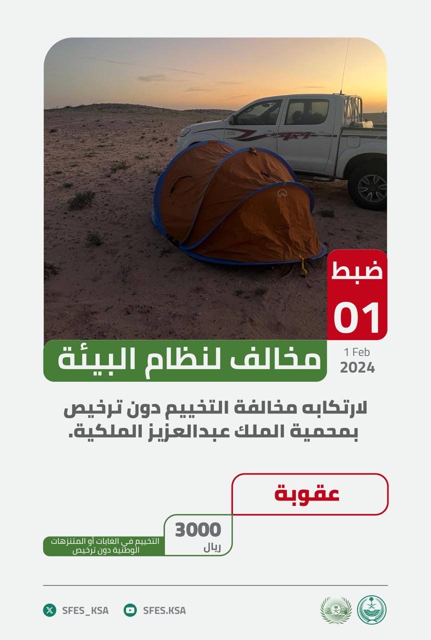 “الأمن البيئي” تضبط مخالفًا لارتكابه مخالفة التخييم دون ترخيص بمحمية الملك عبدالعزيز الملكية
