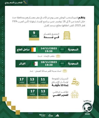 غدا.. انطلاق معسكر الأخضر في جدة استعدادًا لبطولة كأس العرب FIFA قطر 2025
