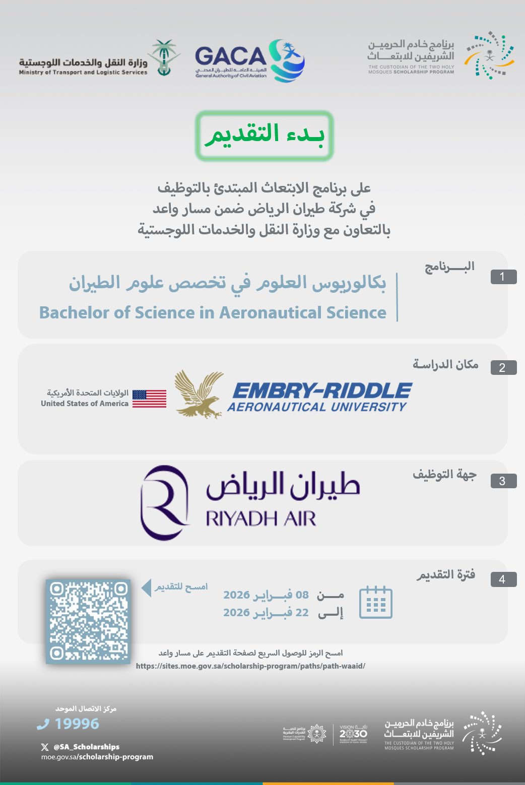 أعلن برنامج خادم الحرمين الشريفين للابتعاث عن فتح باب التقديم على برنامج الابتعاث المبتدئ بالتوظيف المقدم من شركة طيران الرياض، ضمن مسار واعد، أحد مسارات برنامج الابتعاث الخارجي، وذلك بالتعاون مع وزارة النقل والخدمات اللوجستية.