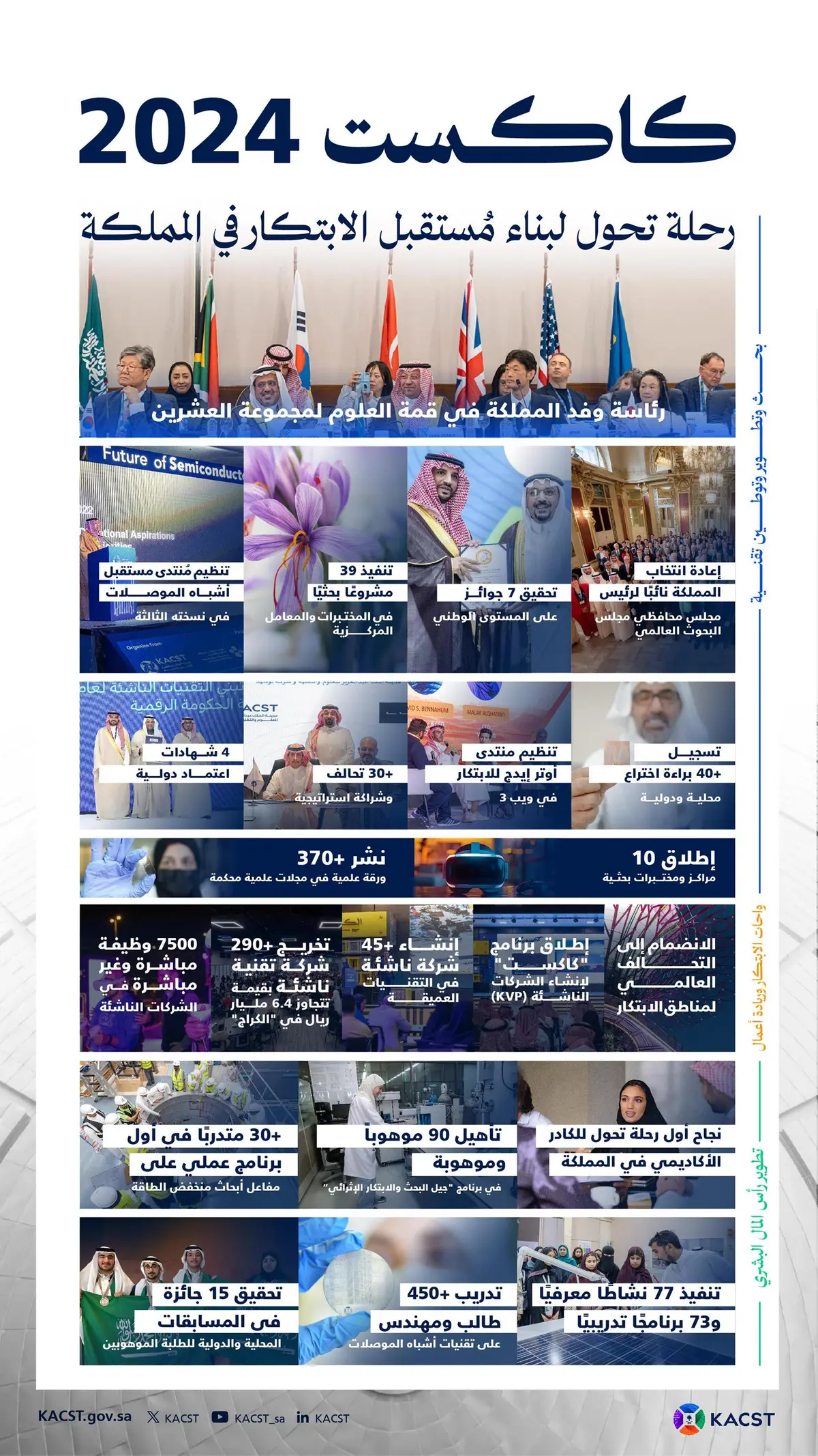 وعززت “كاكست” في عام 2024 جهودها في تنفيذ المبادرات والمشاريع الإستراتيجية في مجالات البحث والتطوير والابتكار، وتسريع التطوير التقني، وتطوير البُنى التحتية، وإنشاء الشركات الناشئة، ودعم ريادي الأعمال؛ التي أثمرت عن إعادة انتخاب المملكة لمنصب نائب رئيس مجلس مُحافظي مجلس البحوث العالمي؛ نظير جهودها في تعزيز العمل الإقليمي المُشترك بين مجالس البحوث بمنطقة الشرق الأوسط وشمال أفريقيا، وانضمامها إلى التحالف العالمي لمناطق الابتكار، وكذلك انضمامها إلى مجموعة مراقبة كوكب الأرض لمواجهة التحدّيات البيئية المرتبطة بتغير المناخ.