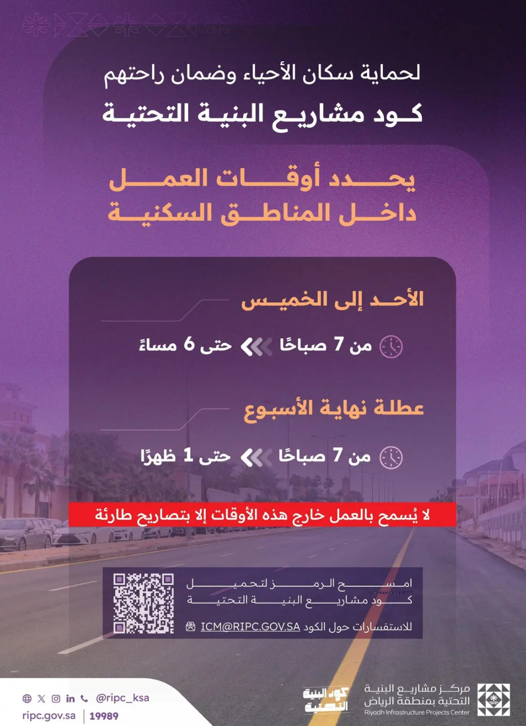 ويهدف هذا الإلزام إلى الحد من تأثير أعمال البنية التحتية على سكان الأحياء من مختلف فئات المجتمع، وضمان راحتهم خارج الأوقات المحددة، وعدم إزعاجهم بالضوضاء الصادرة عن الأعمال، خاصةً في وقت الراحة خلال الفترة المسائية وفي عطلة نهاية الأسبوع، بما يسهم في تعزيز جودة الحياة، وزيادة مستوى رضا السكان.