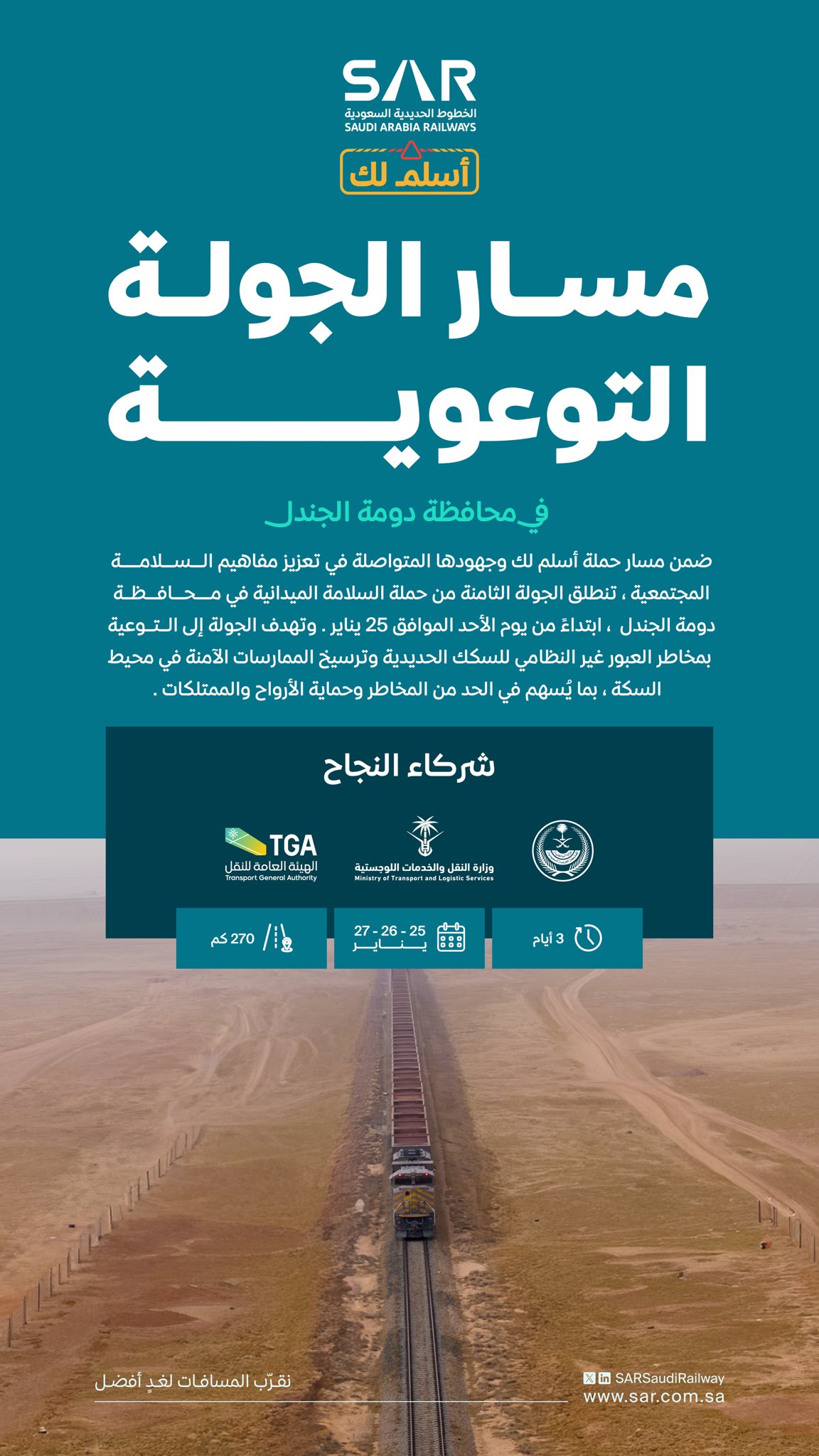 أطلقت الخطوط الحديدية السعودية “سار”، اليوم، الجولة الثامنة من حملتها الميدانية للتوعية بالسلامة “أسلم لك”، التي تبدأ من محافظة دومة الجندل، وتستمر ثلاثة أيام.