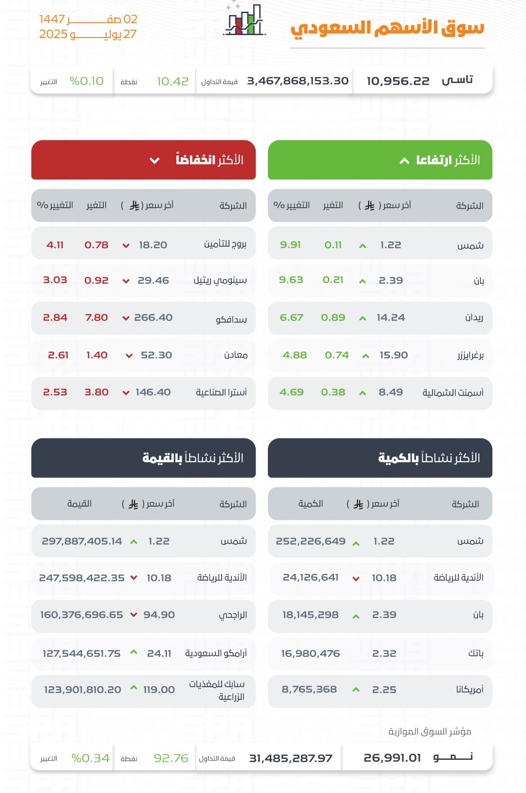 وكانت أسهم شركات شمس، وبان، وريدان، وبرغرايززر، وأسمنت الشمالية، الأكثر ارتفاعًا، أما أسهم شركات بروج للتأمين، وسينومي ريتيل، وسدافكو، ومعادن، وأسترا الصناعية، الأكثر انخفاضًا في التعاملات، وتراوحت نسب الارتفاع والانخفاض ما بين (9.91 %) و (4.11 %). وأسهم شركات شمس، والأندية الرياضية، وبان، وباتك، وأمريكانا، الأكثر نشاطًا بالكمية، فيما كانت أسهم شركات شمس، والأندية الرياضية، والراجحي، وأرامكو السعودية، وسابك للمغذيات الزراعية، هي الأكثر نشاطًا في القيمة.