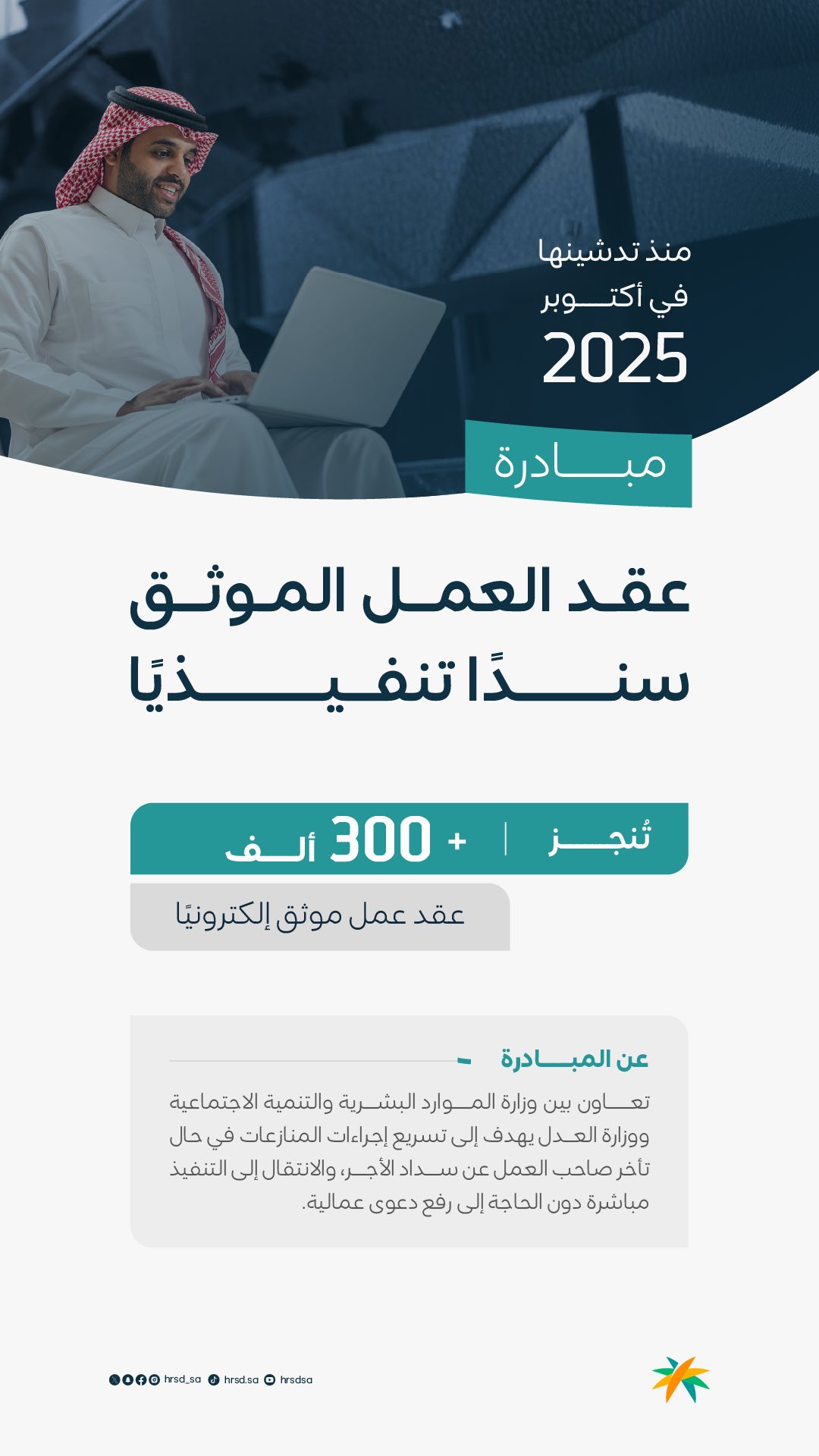 وتعد هذه المبادرة ضمانًا لمستقبل عمل أكثر عدالة وشفافية، كما تُجسّد أحد المسارات التطويرية التي أطلقتها وزارة الموارد البشرية والتنمية الاجتماعية لبناء بيئة عمل قائمة على الوضوح والموثوقية في العلاقة التعاقدية بين العامل وصاحب العمل، بأدوات رقمية تكاملية تنظّم الالتزامات وتحفظ الحقوق بصورة استباقية، انطلاقًا من توجهات رؤية المملكة 2030 الهادفة إلى تعزيز كفاءة سوق العمل واستقراره، وحماية حقوق جميع الأطراف التعاقدية.