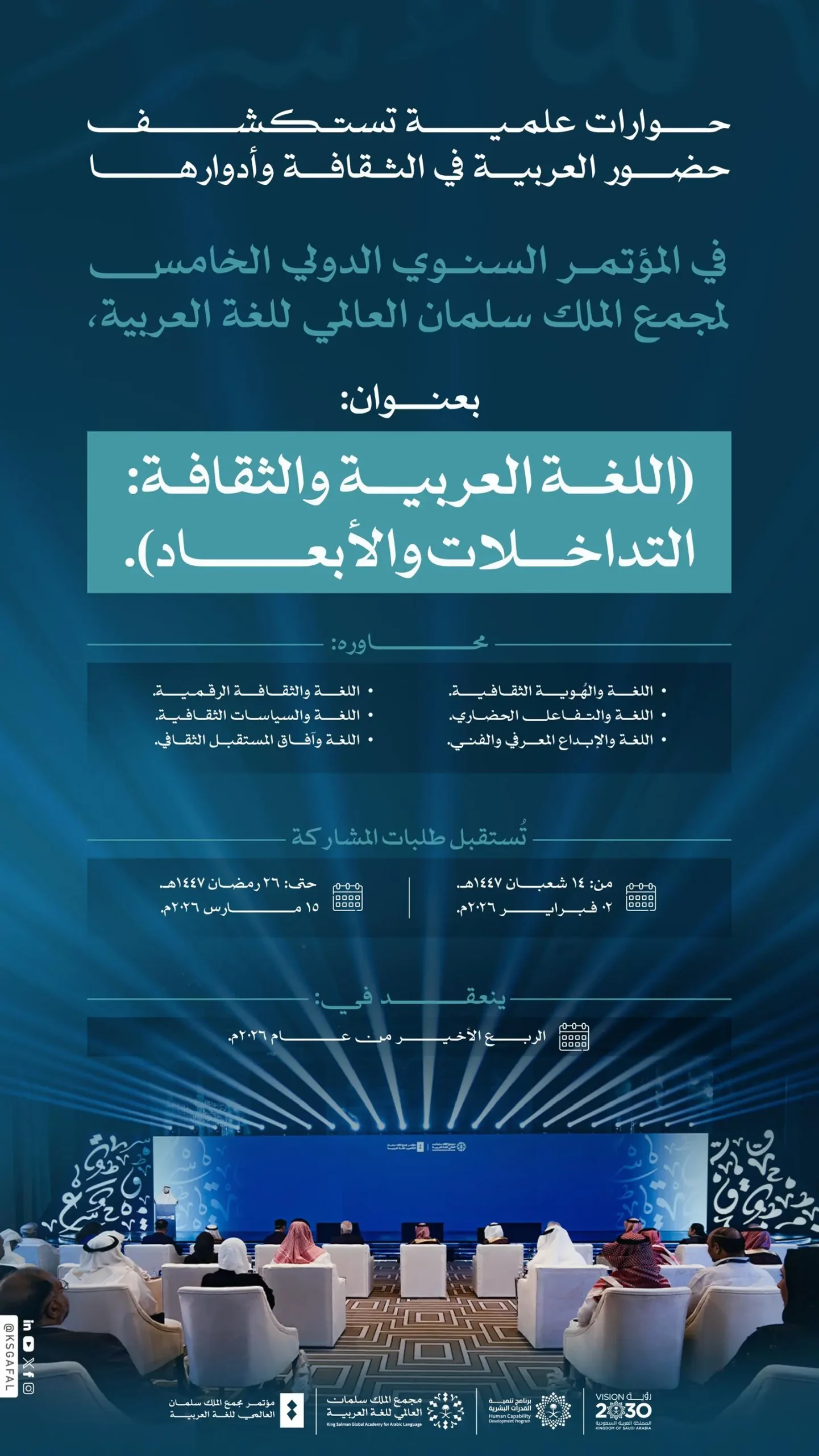 ويدعو المجمع الباحثين الراغبين في المشاركة إلى التقدّم بملخصاتهم العلمية من خلال الرابط: https://conference.ksaa.gov.sa/#/، ويبدأ استقبال طلبات المشاركة والملخصات في 14 شعبان 1447هـ، الموافق 02 فبراير 2026م، ويستمر حتى 26 رمضان 1447هـ، الموافق 15 مارس 2026م، على أن يُعلَن القبول المبدئي للمشاركات في 13 شوال 1447هـ، الموافق 01 أبريل 2026م، في حين سيكون الموعد النهائي لإرسال الأوراق العلمية مكتملةً في 13 ذي الحجة 1447هـ، الموافق 30 مايو 2026م، وتُعلَن الأوراق العلمية المقبولة نهائيًّا في 18 صفر 1448هـ، الموافق 01 أغسطس 2026م، ومن المقرر عقد المؤتمر في الربع الأخير من عام 2026م.