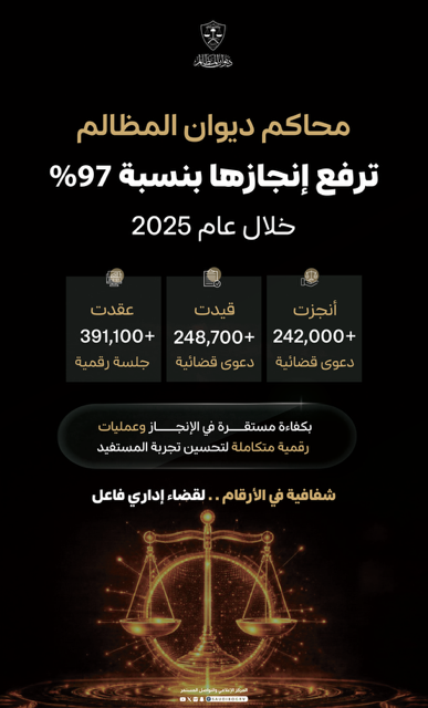 أعلن ديوان المظالم ممثلًا في مركز دعم القرار، أن عدد الدعاوى المنجزة خلال عام 2025 قد بلغ 242,076 دعوى قضائية، فيما بلغ عدد الدعاوى المقيدة 248,773 دعوى، لتكون نسبة إنجاز الدعاوى خلال العام ذاته 97%، كما بلغ عدد الجلسات القضائية التي عُقدت خلال ذات العام 391,132 جلسة قضائية، بارتفاعٍ بلغ 109,532 جلسة قضائية عن عام 2024.
