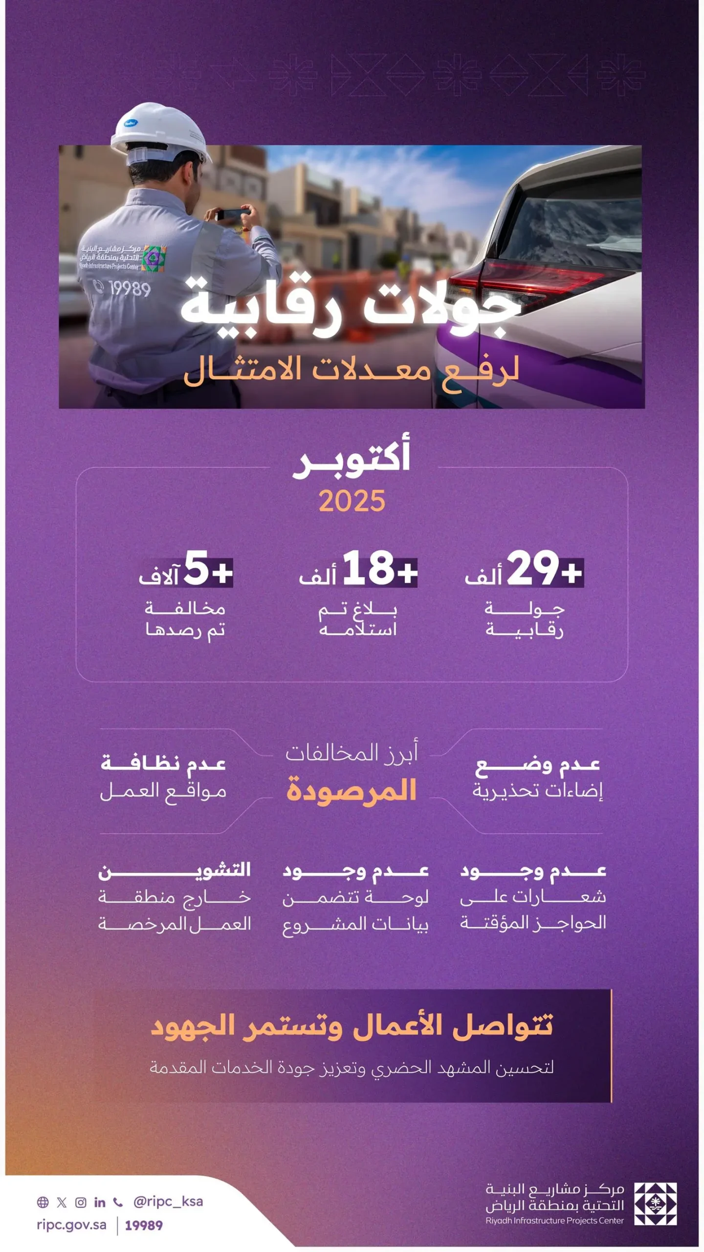 صراحة – الرياض: نفَّذ مركز مشاريع البنية التحتية بمنطقة الرياض خلال شهر أكتوبر 2025م أكثر من 29 ألف جولة رقابية على أعمال المشاريع في مدينة الرياض ومحافظات المنطقة؛ نتج عنها رصد أكثر من 5 آلاف مخالفة.