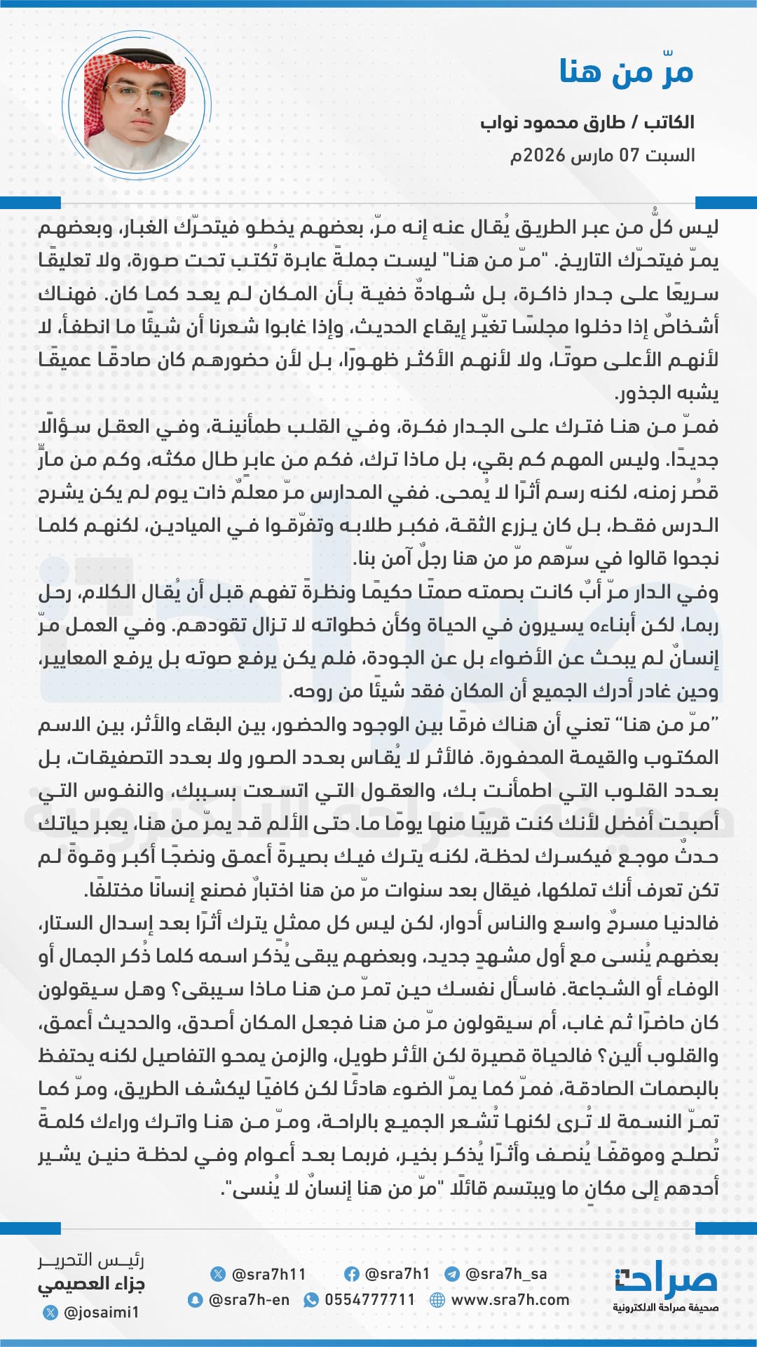 فالدنيا مسرحٌ واسع والناس أدوار، لكن ليس كل ممثلٍ يترك أثرًا بعد إسدال الستار، بعضهم يُنسى مع أول مشهدٍ جديد، وبعضهم يبقى يُذكر اسمه كلما ذُكر الجمال أو الوفاء أو الشجاعة. فاسأل نفسك حين تمرّ من هنا ماذا سيبقى؟ وهل سيقولون كان حاضرًا ثم غاب، أم سيقولون مرّ من هنا فجعل المكان أصدق، والحديث أعمق، والقلوب ألين؟ فالحياة قصيرة لكن الأثر طويل، والزمن يمحو التفاصيل لكنه يحتفظ بالبصمات الصادقة، فمرّ كما يمرّ الضوء هادئًا لكن كافيًا ليكشف الطريق، ومرّ كما تمرّ النسمة لا تُرى لكنها تُشعر الجميع بالراحة، ومرّ من هنا واترك وراءك كلمةً تُصلح وموقفًا يُنصف وأثرًا يُذكر بخير، فربما بعد أعوام وفي لحظة حنين يشير أحدهم إلى مكانٍ ما ويبتسم قائلًا “مرّ من هنا إنسانٌ لا يُنسى”.