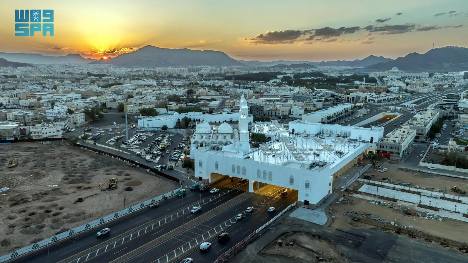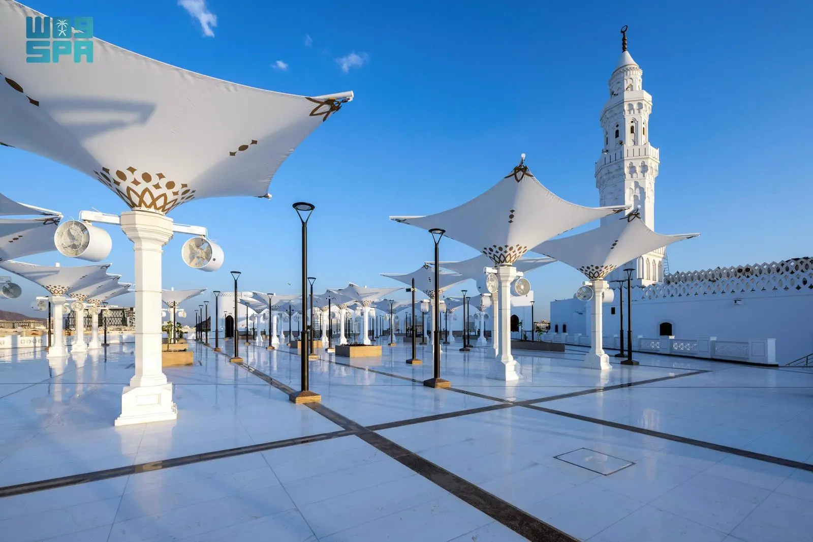 ونُفذ المشروع تحت إشراف هيئة تطوير منطقة المدينة المنورة، ليكون نموذجًا معماريًا يجمع بين الأصالة التاريخية والهوية الإسلامية، والتقنيات الحديثة في البناء والخدمات، حيث تبلغ المساحة الإجمالية للموقع أكثر من (265) ألف مترٍ مربعٍ، فيما تتجاوز مساحة المسجد (3900) مترٍ مربعٍ، بطاقة استيعابية تفوق (20) ألف مصلٍ، مع توفير أكثر من (300) موقفٍ للحافلات والسيارات، إلى جانب تركيب أكثر من (50) مِظلة مزودة بـ (100) مروحة رذاذ، تُسهم في تلطيف الأجواء، وتصميمٍ حديثٍ للممرات والساحات، يُعزّز انسيابية الحركة، ويُهيئ بيئة مريحة للمصلين والزوار.