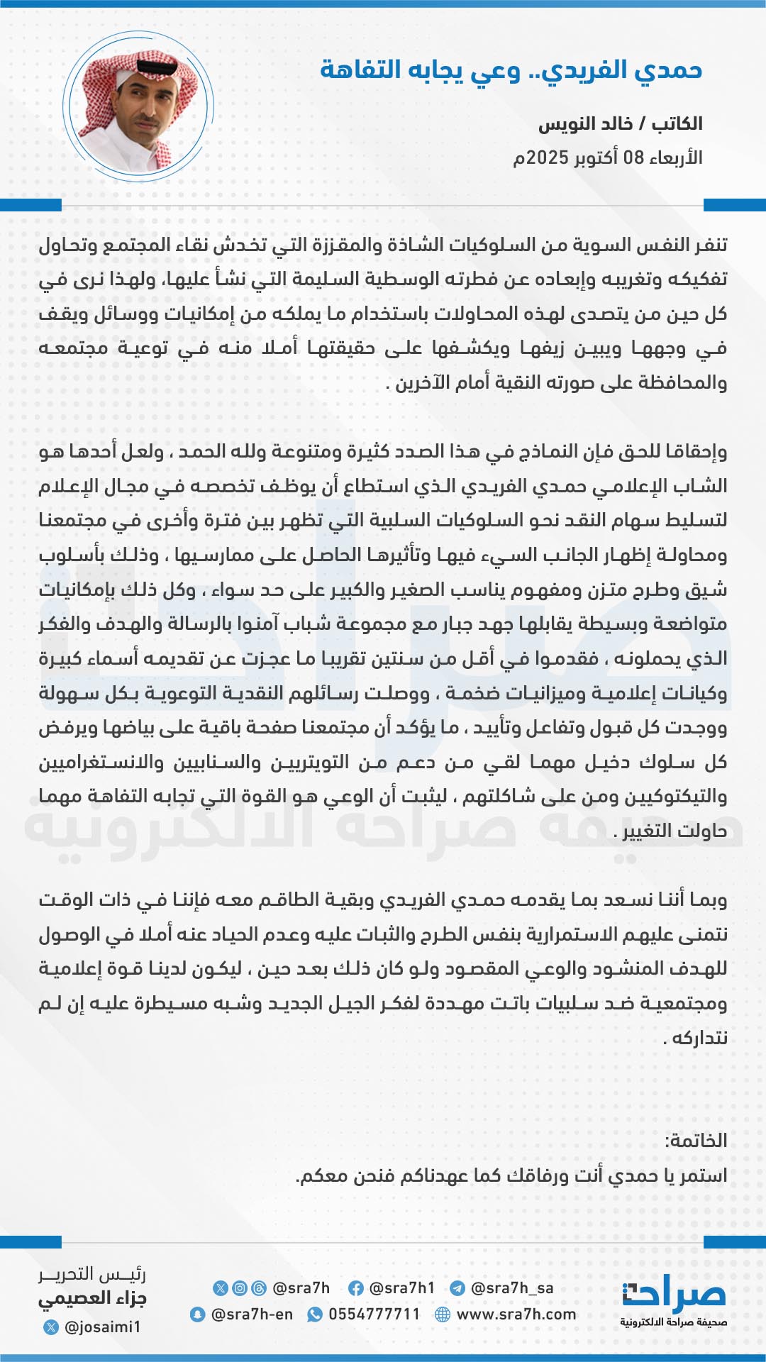 وإحقاقا للحق فإن النماذج في هذا الصدد كثيرة ومتنوعة ولله الحمد ، ولعل أحدها هو الشاب الإعلامي حمدي الفريدي الذي استطاع أن يوظف تخصصه في مجال الإعلام لتسليط سهام النقد نحو السلوكيات السلبية التي تظهر بين فترة وأخرى في مجتمعنا ومحاولة إظهار الجانب السيء فيها وتأثيرها الحاصل على ممارسيها ، وذلك بأسلوب شيق وطرح متزن ومفهوم يناسب الصغير والكبير على حد سواء ، وكل ذلك بإمكانيات متواضعة وبسيطة يقابلها جهد جبار مع مجموعة شباب آمنوا بالرسالة والهدف والفكر الذي يحملونه ، فقدموا في أقل من سنتين تقريبا ما عجزت عن تقديمه أسماء كبيرة وكيانات إعلامية وميزانيات ضخمة ، ووصلت رسائلهم النقدية التوعوية بكل سهولة ووجدت كل قبول وتفاعل وتأييد ، ما يؤكد أن مجتمعنا صفحة باقية على بياضها ويرفض كل سلوك دخيل مهما لقي من دعم من التويتريين والسنابيين والانستغراميين والتيكتوكيين ومن على شاكلتهم ، ليثبت أن الوعي هو القوة التي تجابه التفاهة مهما حاولت التغيير .