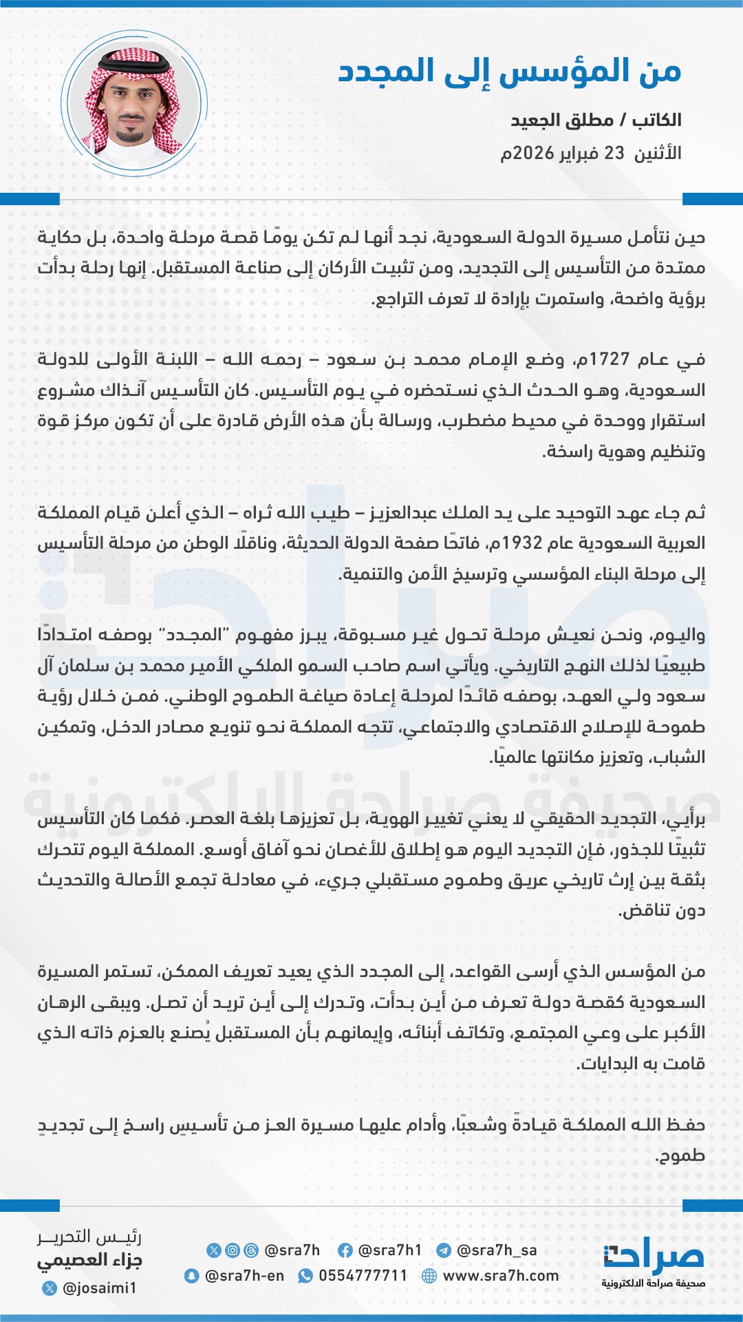 من المؤسس الذي أرسى القواعد، إلى المجدد الذي يعيد تعريف الممكن، تستمر المسيرة السعودية كقصة دولة تعرف من أين بدأت، وتدرك إلى أين تريد أن تصل. ويبقى الرهان الأكبر على وعي المجتمع، وتكاتف أبنائه، وإيمانهم بأن المستقبل يُصنع بالعزم ذاته الذي قامت به البدايات.