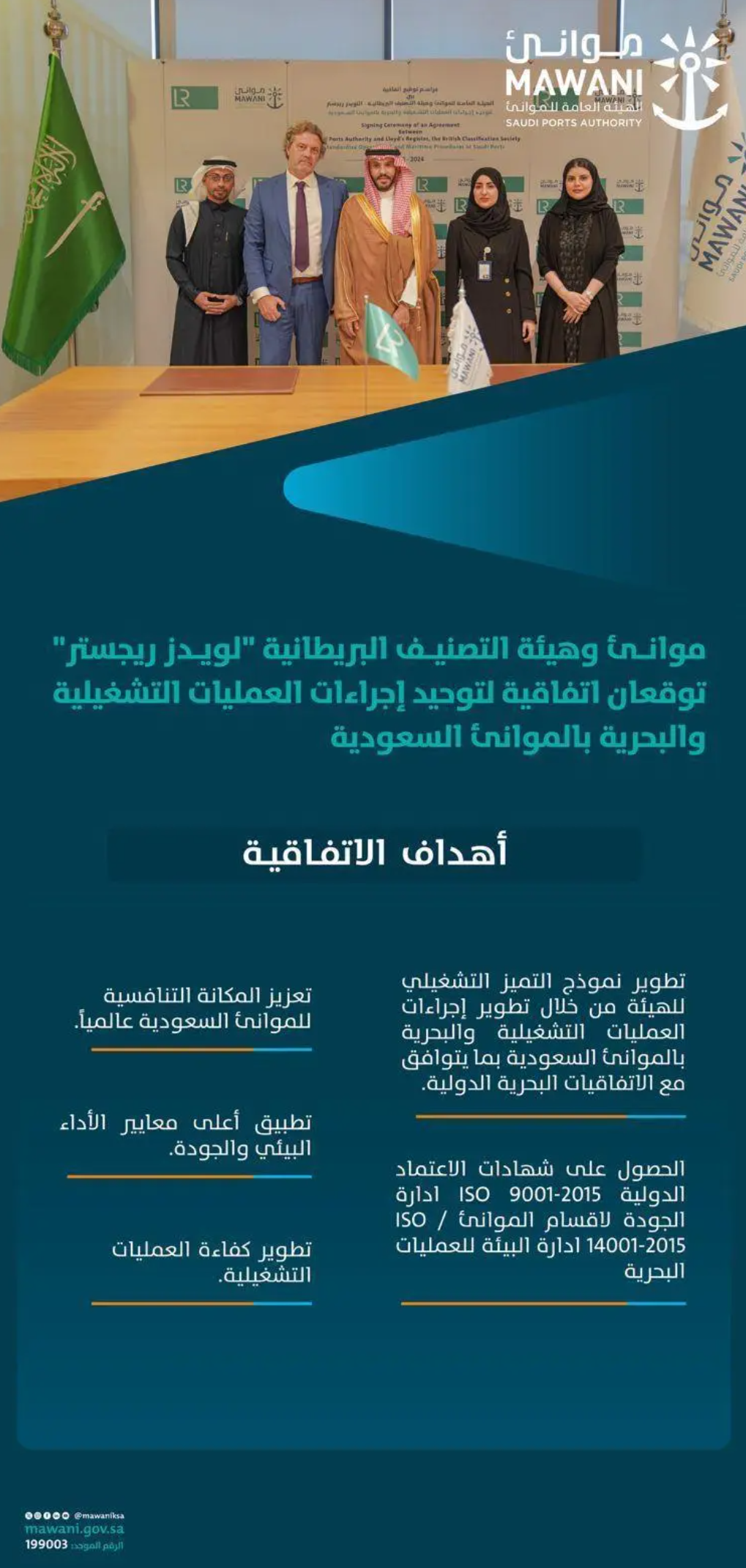 “موانئ” وهيئة التصنيف البريطانية “لويدز ريجستر” توقعان اتفاقية لتوحيد إجراءات العمليات التشغيلية والبحرية بالموانئ السعودية
