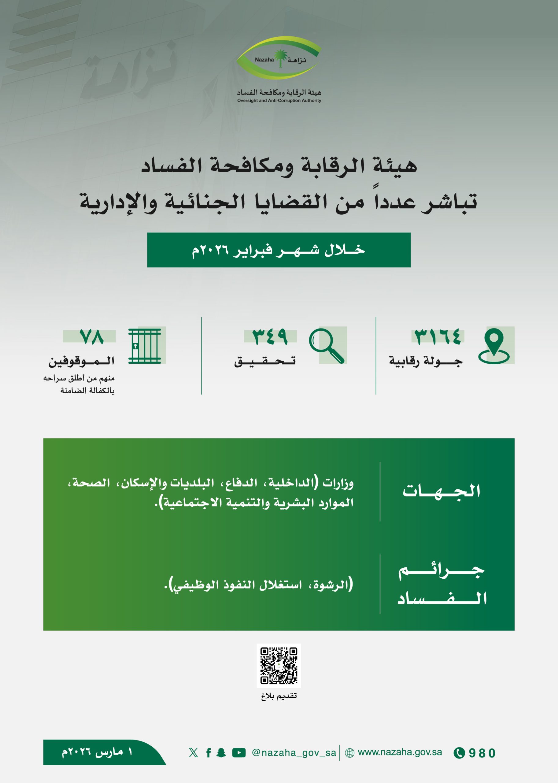 “نزاهة” : (3164) جولة رقابية و(349) تحقيقًا خلال فبراير.. وإيقاف (78) متهمًا بقضايا فساد #عاجل