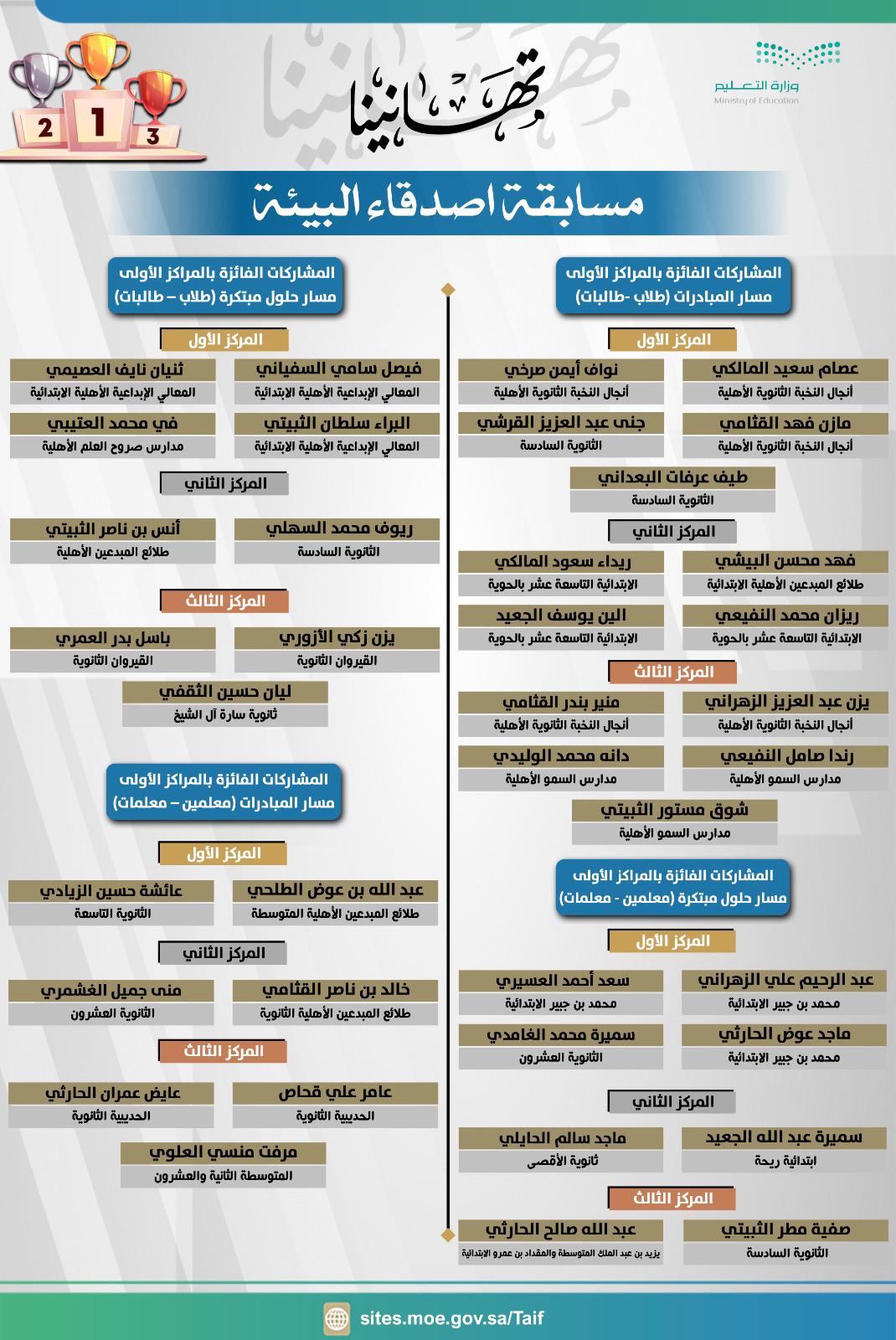 تعليم #الطائف يعلن نتائج مسابقة أصدقاء البيئة ضمن فعاليات الاحتفاظ باليوم الوطني الـ94