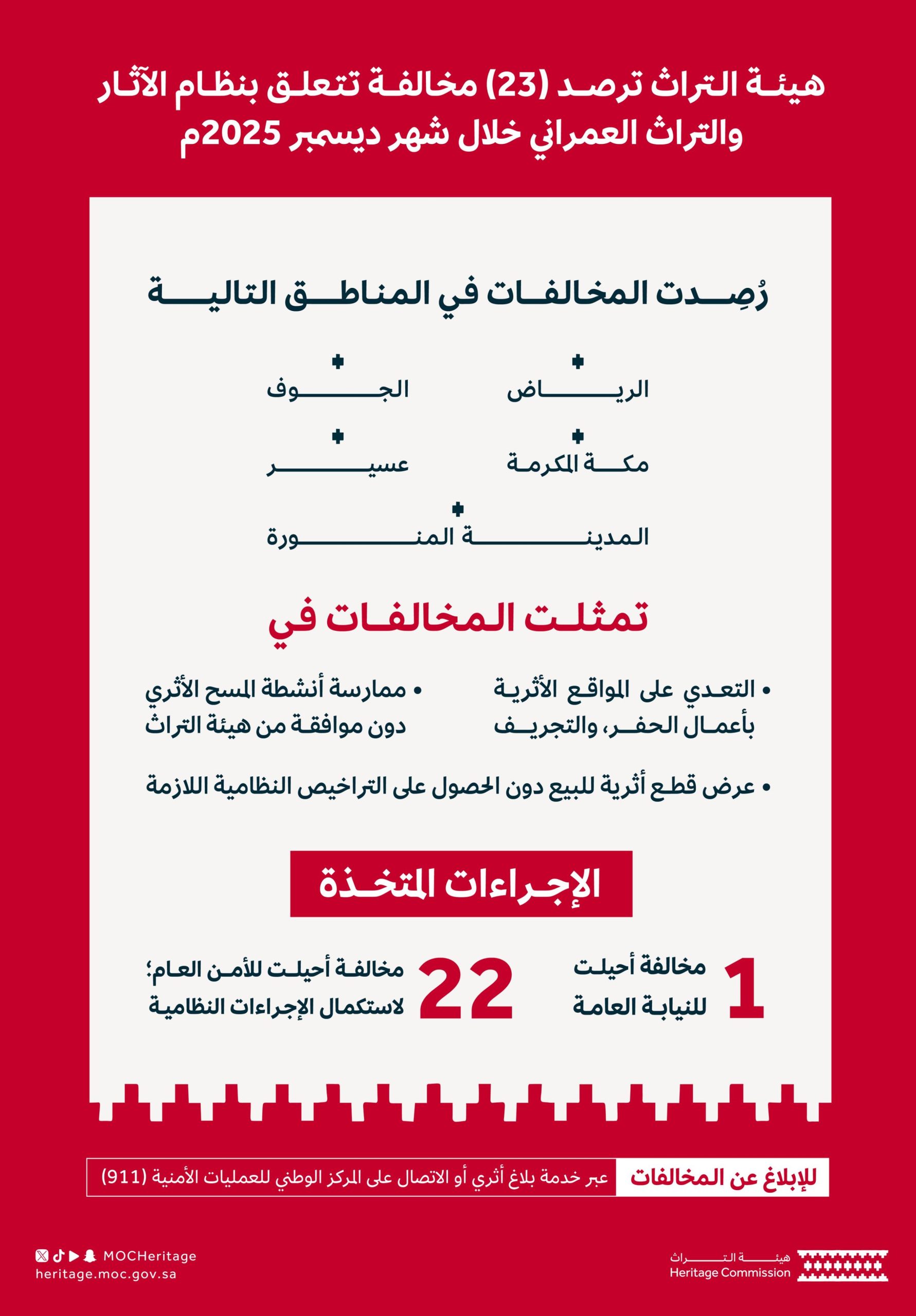 أعلنت هيئة التراث، رصدها (23) مخالفة خلال شهر ديسمبر عام 2025م، تتعلق بنظام الآثار والتراث العمراني، وذلك ضمن أعمالها في الرقابة والمتابعة التي تنفذها لحماية مواقع التراث الثقافي والقطع الأثرية من أي تجاوزات، تطبيقًا للأنظمة والتعليمات ذات الصلة، وتعزيز الحضور الرقابي في مختلف مناطق المملكة.