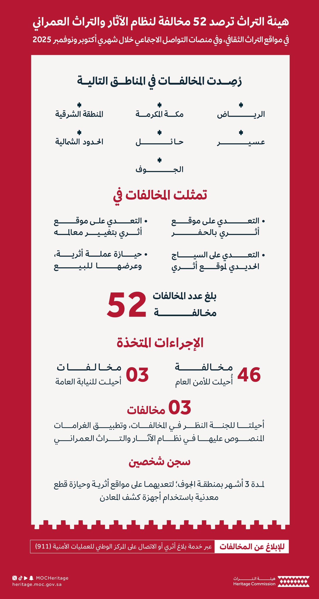 رصدت هيئة التراث خلال شهري أكتوبر ونوفمبر 2025 ما مجموعه 52 مخالفة متعلقة بنظام الآثار والتراث العمراني في عدد من المناطق، وذلك ضمن جهودها لحماية المواقع الأثرية والحفاظ على التراث الوطني.