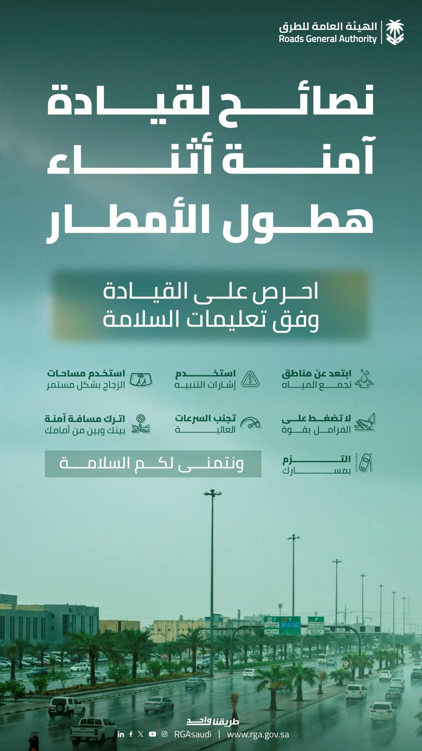 دعت الهيئة العامة للطرق قائدي المركبات ومستخدمي الطرق إلى الالتزام بإرشادات السلامة أثناء هطول الأمطار خلال رحلاتهم بين مدن المملكة؛ بهدف ضمان سلامة الجميع، وذلك في إطار الجهود المتواصلة التي تبذلها الهيئة؛ لرفع مستوى السلامة، وخفض نسبة الوفيات على الطرق.