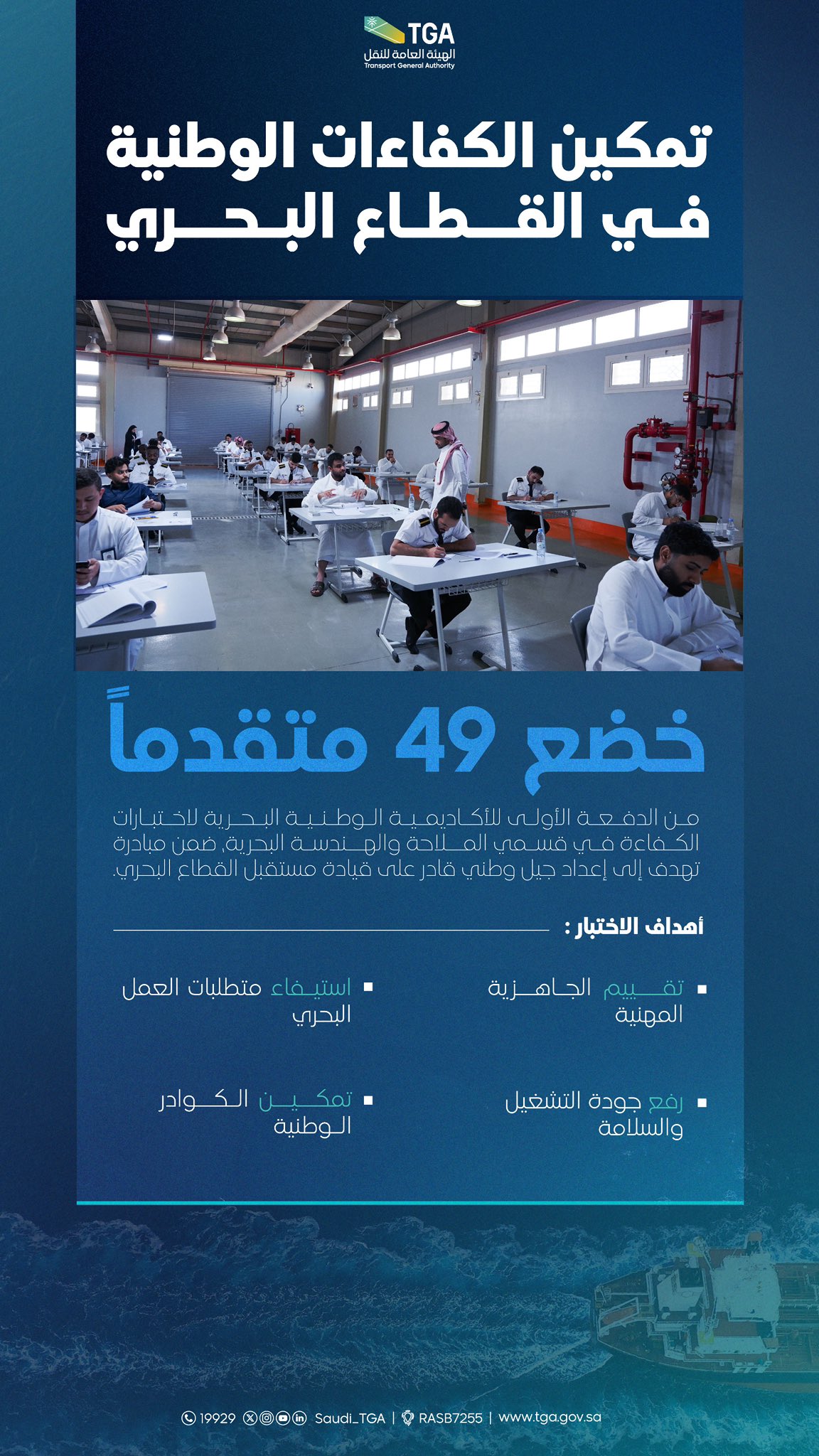 أجرت الهيئة العامة للنقل ممثلةً بإدارة اعتماد التأهيل البحري، اليوم، اختبارات الكفاءة للملاحة والهندسة البحرية لـ49 متقدمًا من طلاب الأكاديمية الوطنية البحرية، وذلك في مقر الأكاديمية.