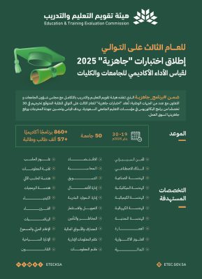 صراحة – الرياض : تطلق هيئة تقويم التعليم والتدريب الأسبوع القادم الدورة الثالثة للاختبارات المعيارية لخريجي الجامعات والكليات السعودية ضمن برنامج جاهزية، الذي تنفذه الهيئة بالتكامل مع مجلس شؤون الجامعات لضمان وضبط جودة مخرجات الجامعات ورفع جاهزية خريجيها لسوق العمل، والإسهام في تحقيق مستهدفات رؤية السعودية 2030 وبرنامج تنمية القدرات البشرية، وإعداد مواطن منافس عالمياً ومتميز علمياً ومهارياً، ويستهدف البرنامج في هذا العام عقد اختبارات معيارية لثلاثين تخصصًا جامعيًا خلال الفترة من 19 إلى 30 يناير 2025.