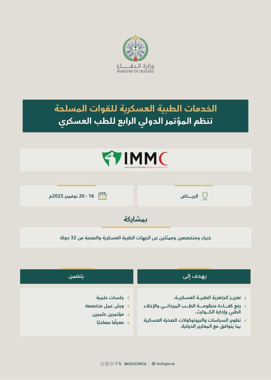 تنظم وزارة الدفاع ممثلةً في الإدارة العامة للخدمات الطبية العسكرية في الرياض، المؤتمر الدولي الرابع للطب العسكري، وذلك خلال الفترة من 16 إلى 20 نوفمبر الجاري، بمشاركة نخبة من المتحدثين المحليين والدوليين من 32 دولة شقيقة وصديقة.