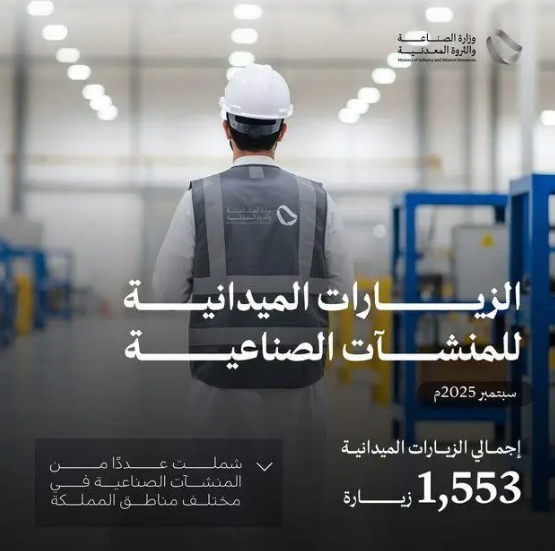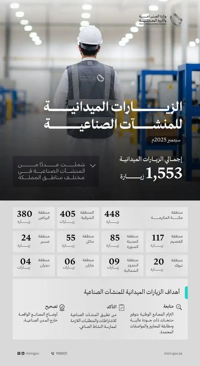 وأوضح المتحدث الرسمي لوزارة الصناعة والثروة المعدنية جراح الجراح، أنَّ الزيارات الميدانية المُنفَّذة خلال شهر سبتمبر 2025 شملت: 448 زيارة للمصانع في منطقة مكة المكرمة، و405 زيارات في المنطقة الشرقية، و380 زيارة في منطقة الرياض، إضافة إلى 117 زيارة في منطقة القصيم، و85 زيارة في منطقة المدينة المنورة، و55 زيارة في منطقة حائل، و24 زيارة في منطقة عسير، و20 زيارة في منطقة تبوك، و9 زيارات في منطقة الحدود الشمالية، و6 زيارات في منطقة جازان، و4 زيارات في منطقة نجران.