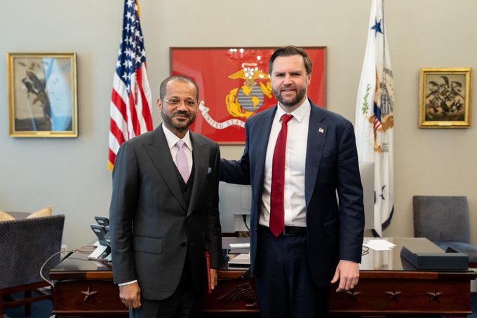 التقى معالي السيد بدر البوسعيدي، وزير الخارجية العماني، بالسيد جي دي فانس، نائب الرئيس الأمريكي، في إطار المساعي الدبلوماسية المستمرة لتعزيز الاستقرار في المنطقة.