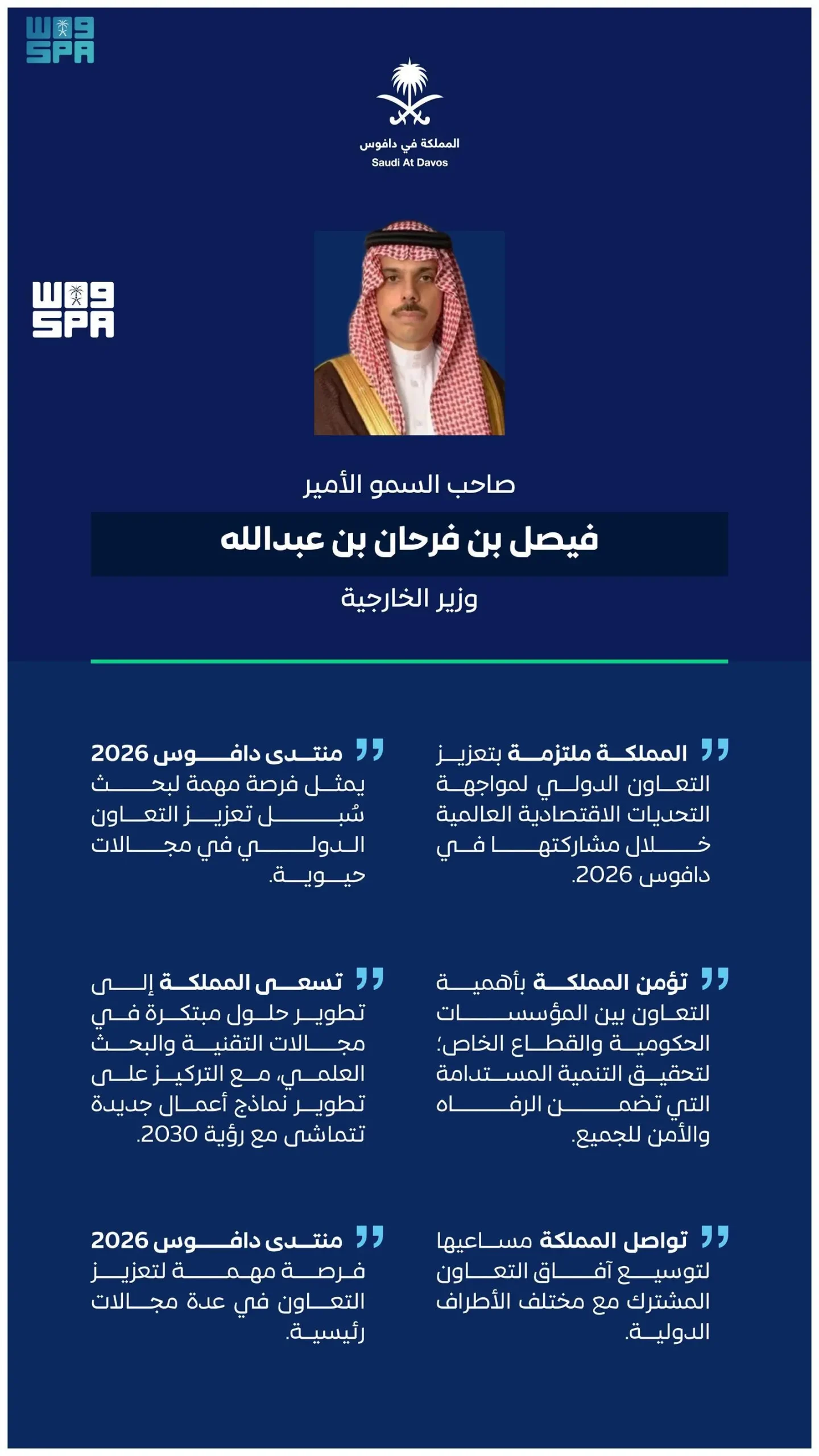 وزير الخارجية: المملكة ملتزمة بتعزيز التعاون الدولي لمواجهة التحديات الاقتصادية العالمية خلال مشاركتها في دافوس 2026