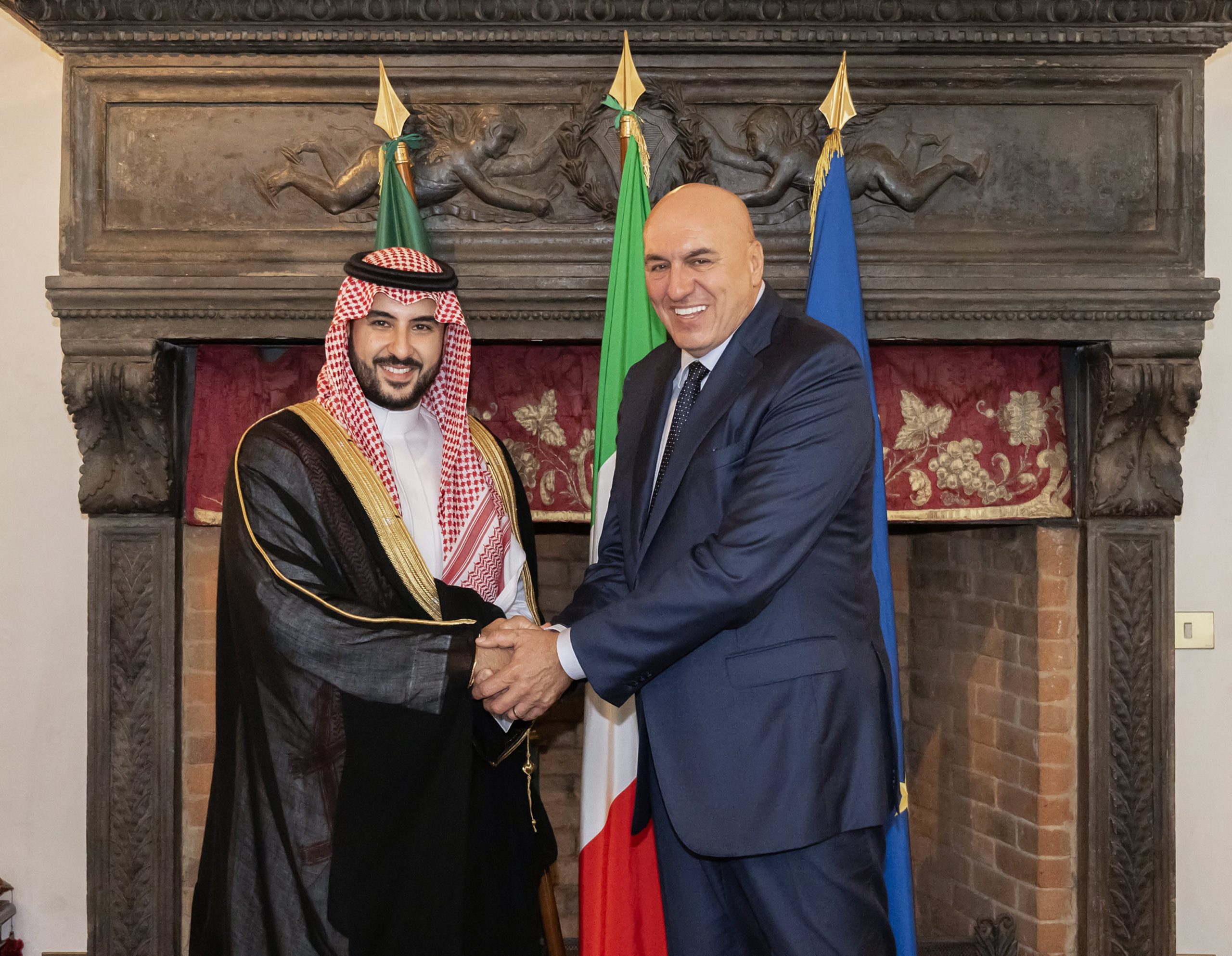 صراحة – متابعات: عقد سمو وزير الدفاع الامير خالد بن سلمان اجتماعًا مع نظيره الإيطالي لمناقشة التعاون الثنائي في المجال الدفاعي وسبل تعزيزه. تناول الاجتماع الموسع بين الطرفين آخر التطورات في المنطقة والعالم، في ظل التحديات الأمنية المتزايدة.