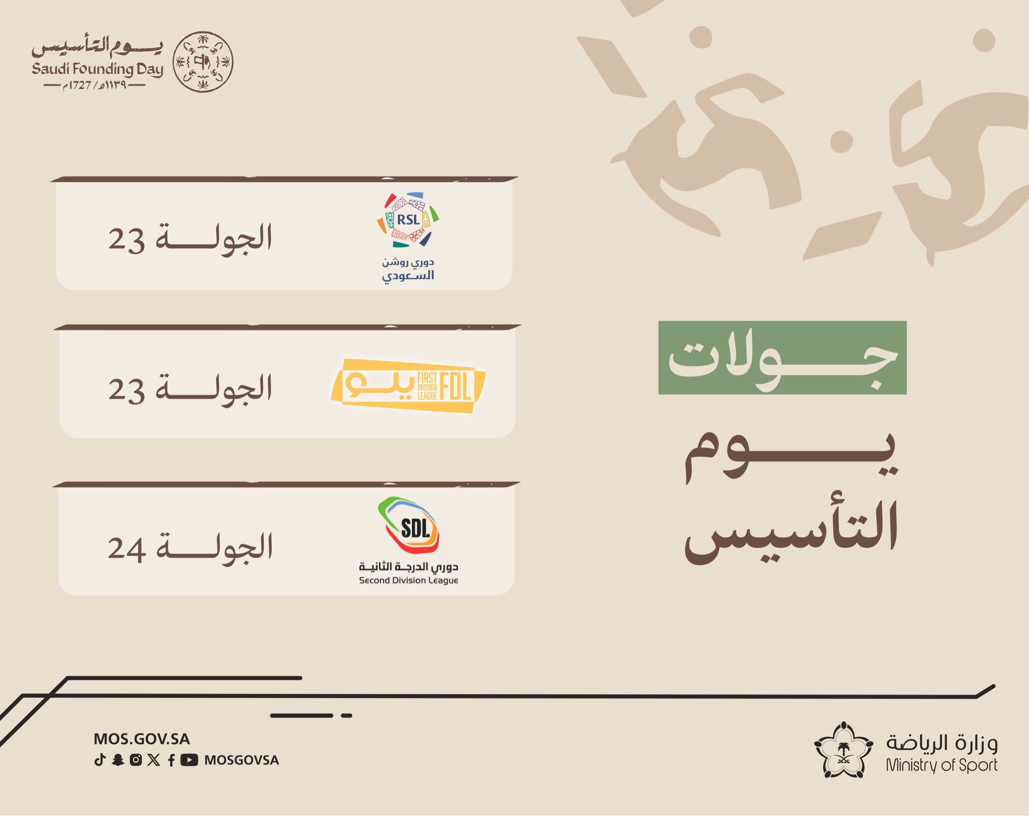 اعتمد صاحب السمو الملكي الأمير عبدالعزيز بن تركي الفيصل، وزير الرياضة رئيس اللجنة الأولمبية والبارالمبية السعودية، تسمية الجولة 23 من الدوري السعودي للمحترفين، والجولة 23 من دوري الدرجة الأولى السعودي، إلى جانب الجولة 24 من دوري الدرجة الثانية السعودي، بـ«جولة يوم التأسيس».
