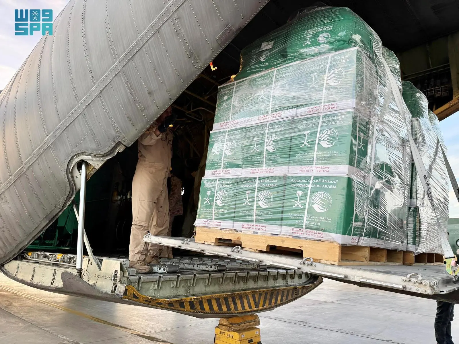 وتحمل الطائرة السعودية الـ(79) على متنها سلالًا غذائية وحقائب إيوائية، تمهيدًا لنقلها إلى المتضررين من الشعب الفلسطيني الشقيق داخل قطاع غزة.