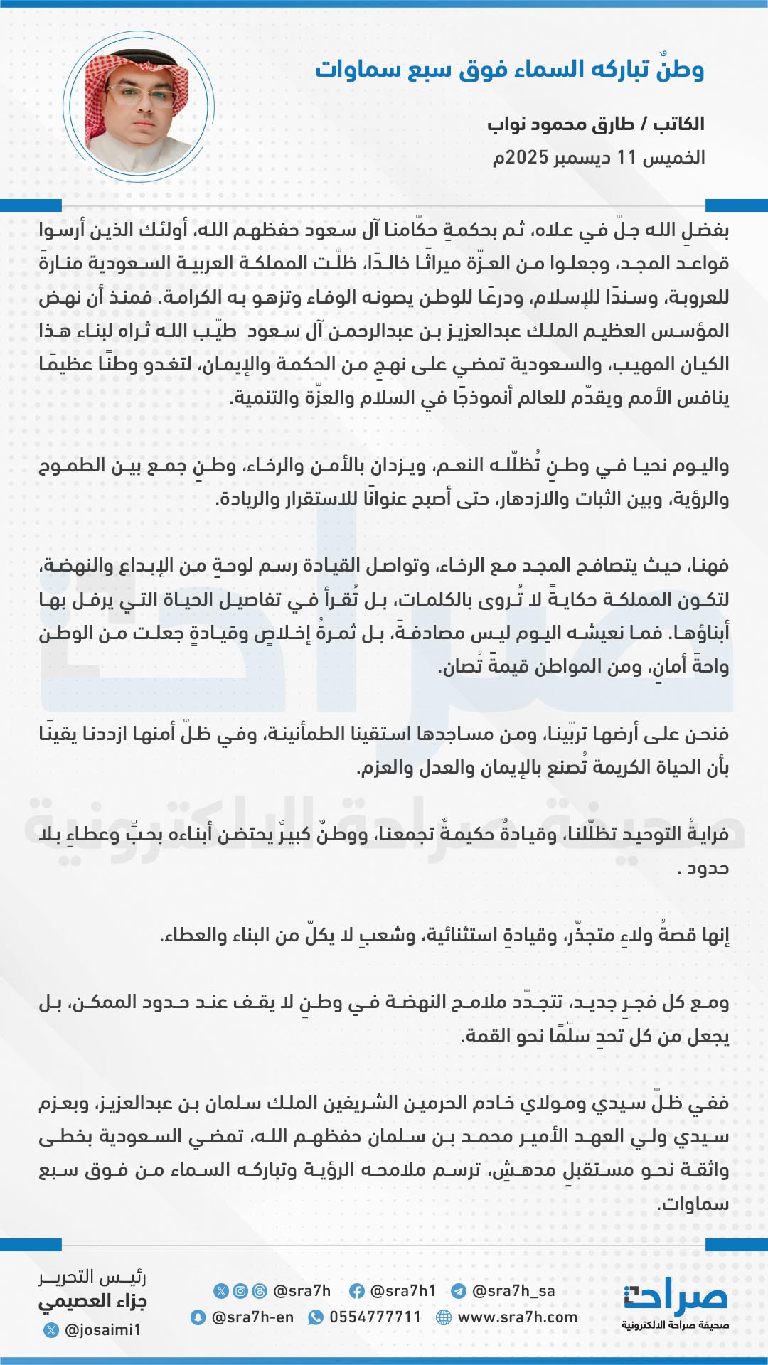 فهنا، حيث يتصافح المجد مع الرخاء، وتواصل القيادة رسم لوحةٍ من الإبداع والنهضة، لتكون المملكة حكايةً لا تُروى بالكلمات، بل تُقرأ في تفاصيل الحياة التي يرفل بها أبناؤها. فما نعيشه اليوم ليس مصادفةً، بل ثمرةُ إخلاصٍ وقيادةٍ جعلت من الوطن واحةَ أمانٍ، ومن المواطن قيمةً تُصان.