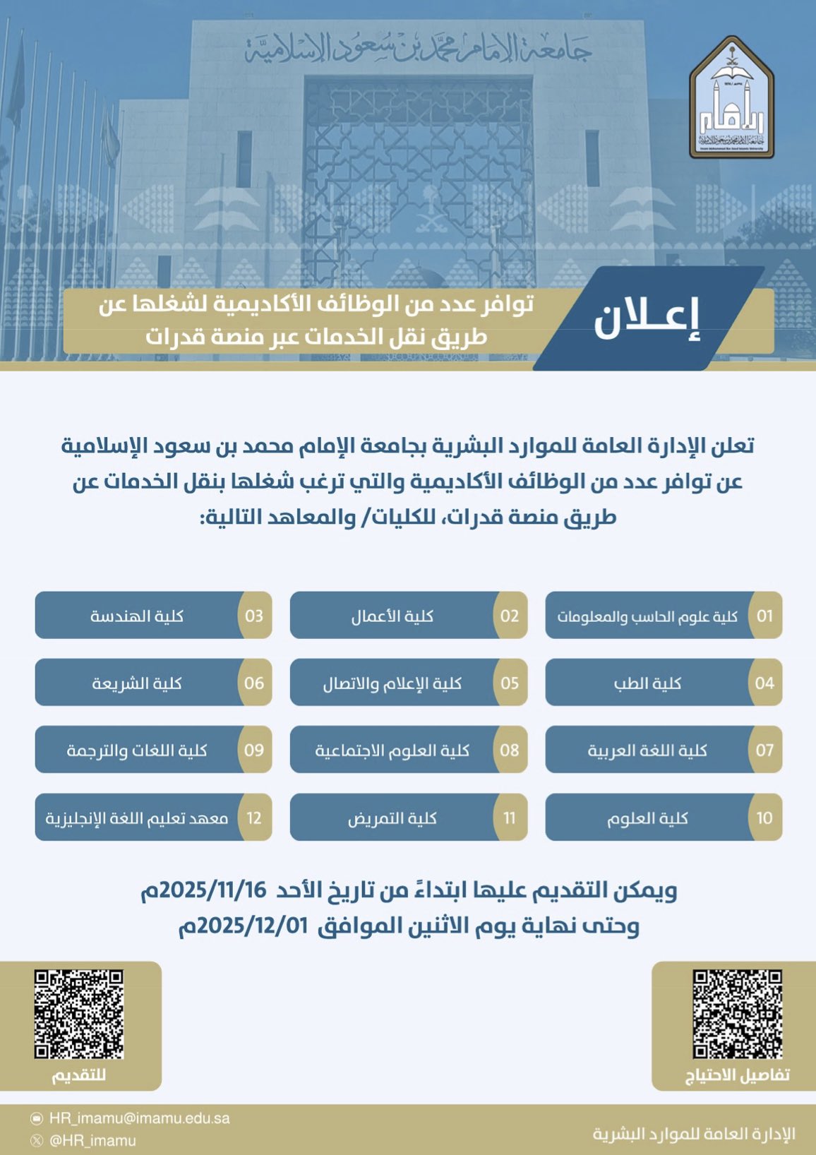 أعلنت الإدارة العامة للموارد البشرية بجامعة الإمام محمد بن سعود الإسلامية عن توافر عدد من الوظائف الأكاديمية الشاغرة، والتي سيتم شغلها عن طريق نقل الخدمات وفق الاحتياجات المعلنة، وذلك عبر منصة قدرات.