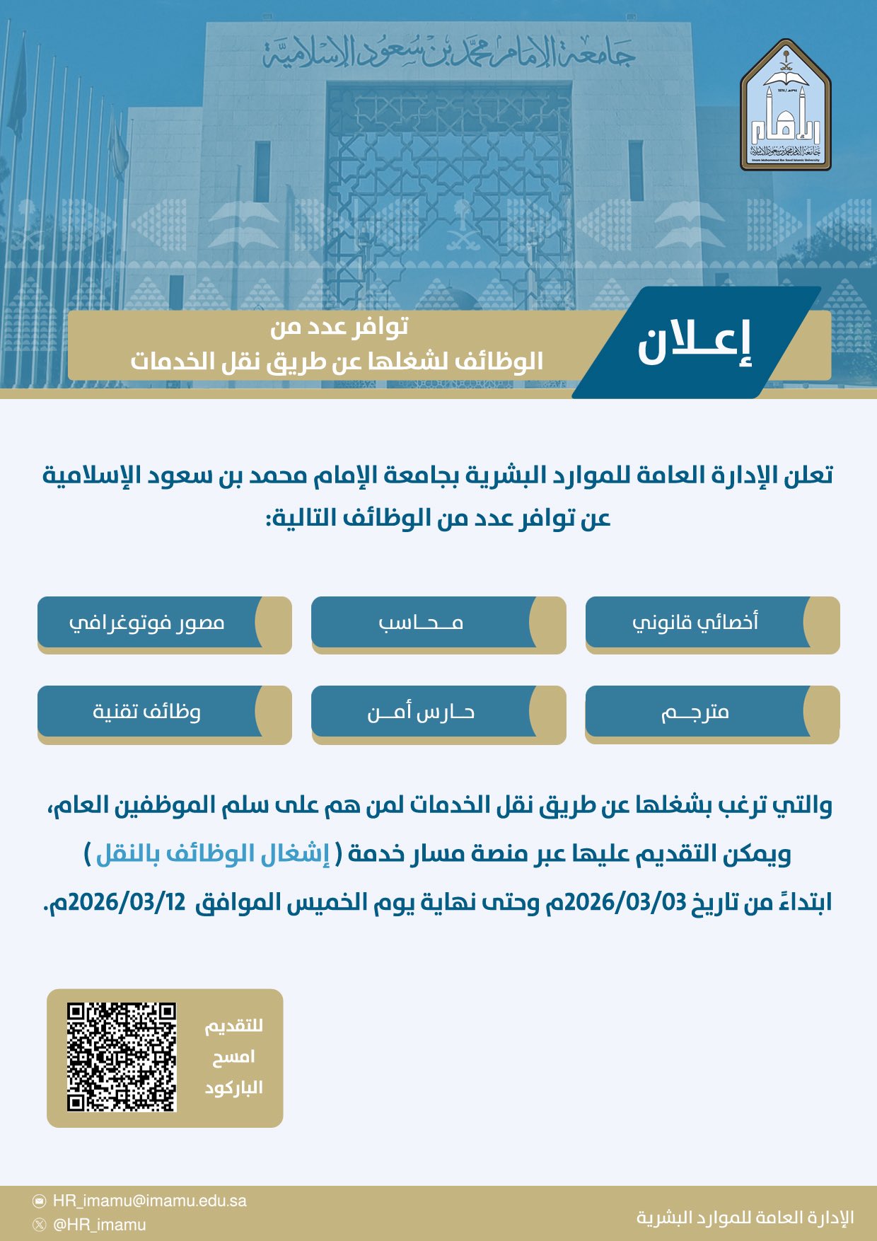 أعلنت الإدارة العامة للموارد البشرية بـ ‎جامعة الإمام عن توافر عدد من الوظائف، وترغب في شغلها من خلال نقل الخدمات لمن هم على سلم الموظفين العام.
