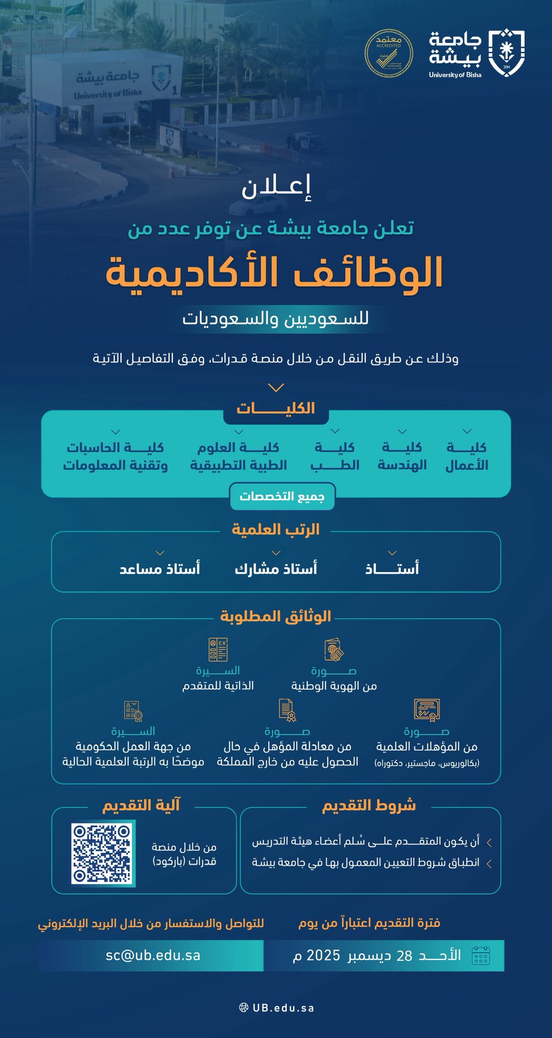 أعلنت جامعة بيشة عن توفر عدد من الوظائف الأكاديمية للسعوديين والسعوديات، وذلك عن طريق النقل عبر منصة قدرات، في عدد من الكليات والتخصصات العلمية، للعمل بالرتب الأكاديمية: أستاذ، أستاذ مشارك، أستاذ مساعد.