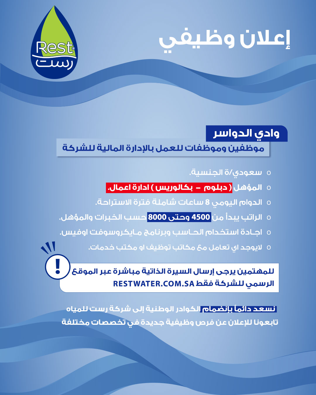 أعلنت شركة مياه رست عن توفر شاغر وظيفي للعمل في وادي الدواسر ، وذلك ضمن سعيها لاستقطاب الكفاءات المؤهلة لوظائف المحاسبة.