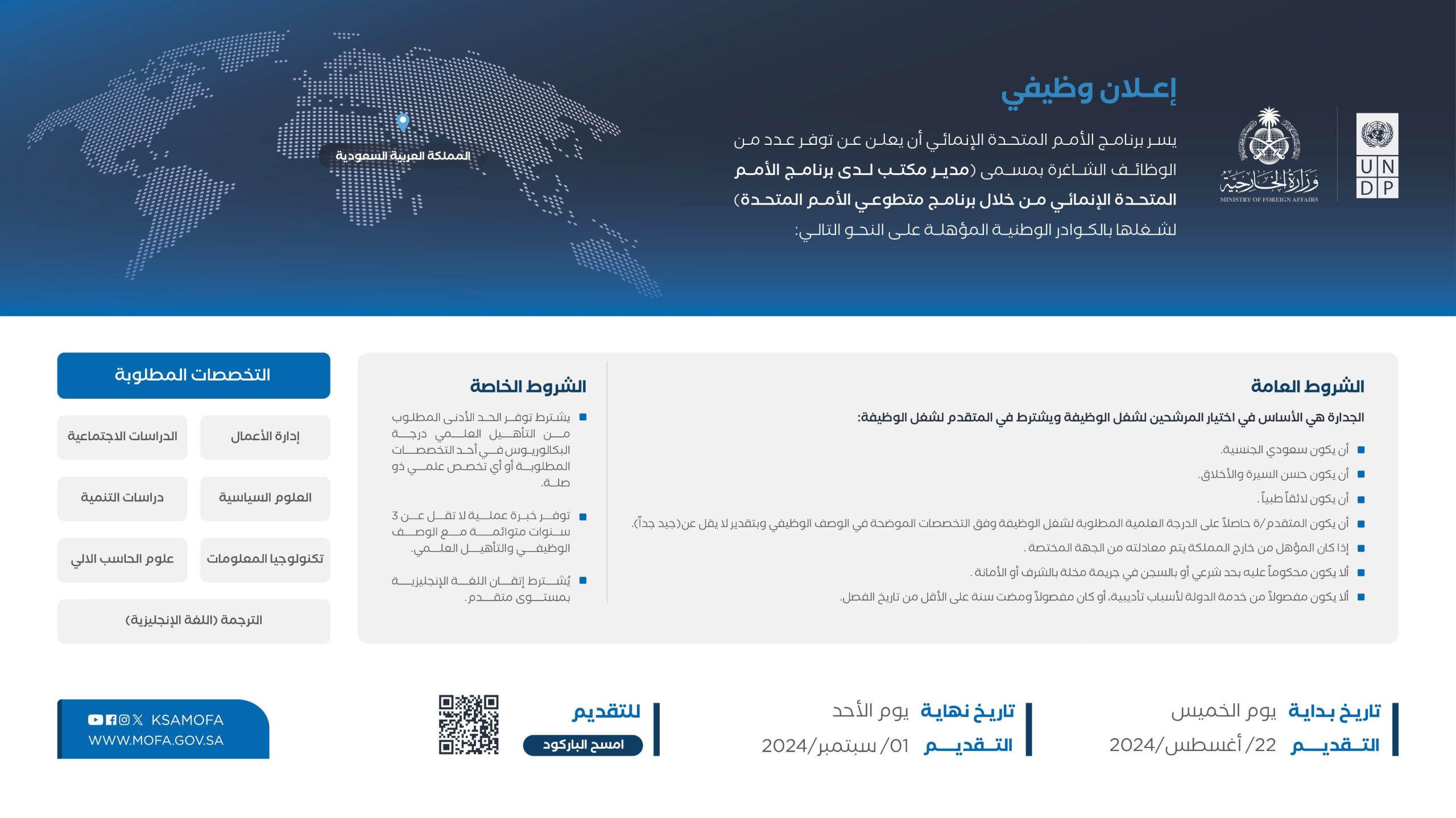 صراحة – الرياض : أعلنت وزارة الخارجية عن توفر وظائف شاغرة بمسمى (مدير مكتب لدى برنامج الأمم المتحدة الإنمائي من خلال برنامج متطوعي الأمم المتحدة) لشغلها بالكوادر الوطنية المؤهلة.